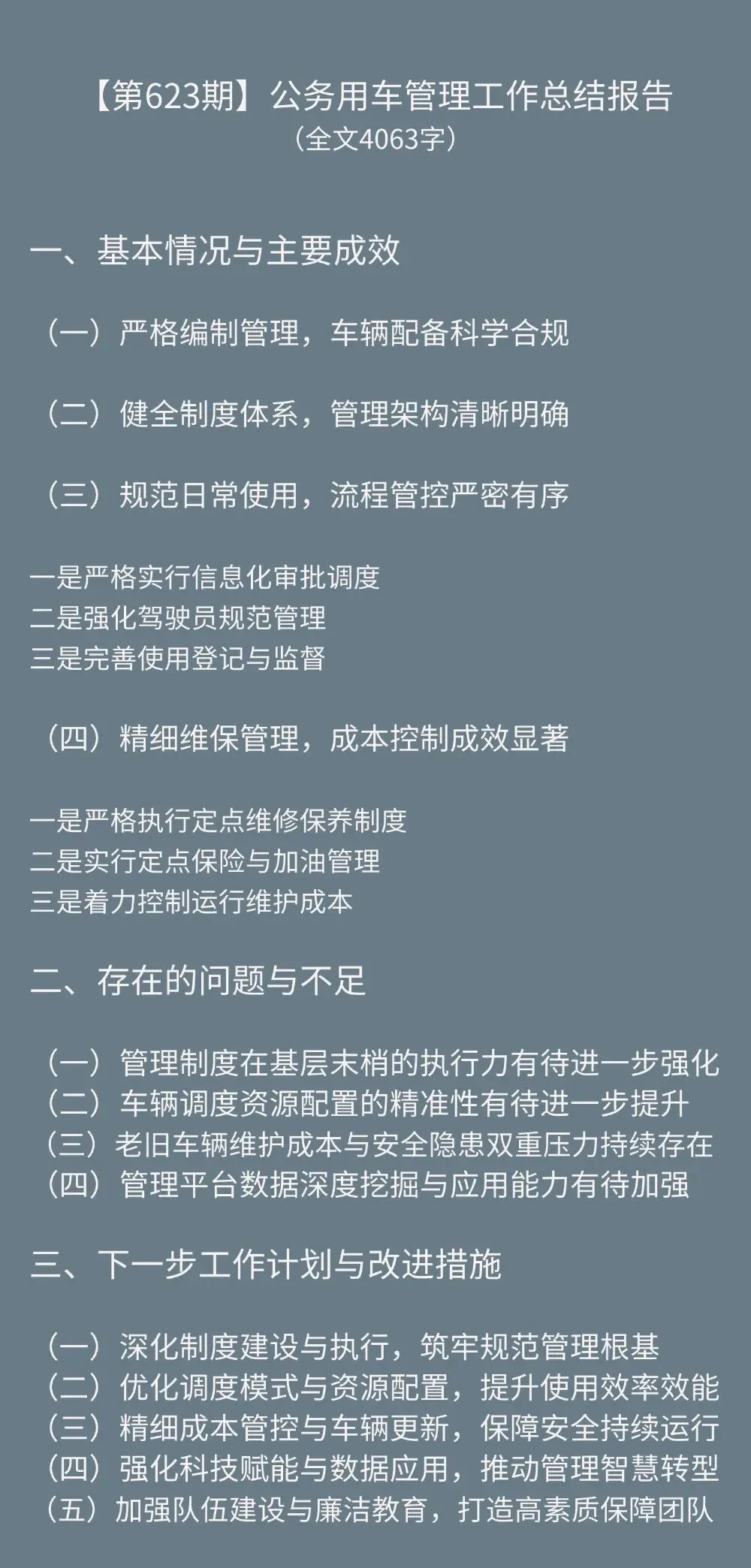 今天推荐一篇《公务用车管理工作总结报告》,全文4063字。文章一是结构严谨,通过"成绩成效+问题短板+改进路径"的递进逻辑,形成完整的管理闭环;二是数据运用精当,通过"一车一档""百公里油耗下降X%"等量化表述,将抽象管理转化为可视化数据画像;三是语言凝练庄重,善用排比句式增强语势,图表数据与文字分析相得益彰。全文