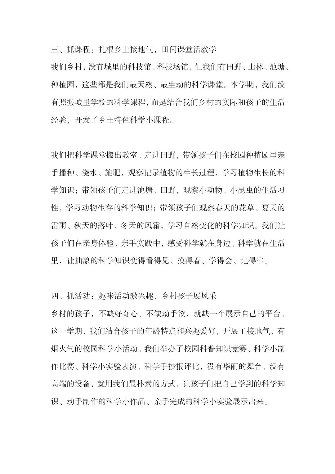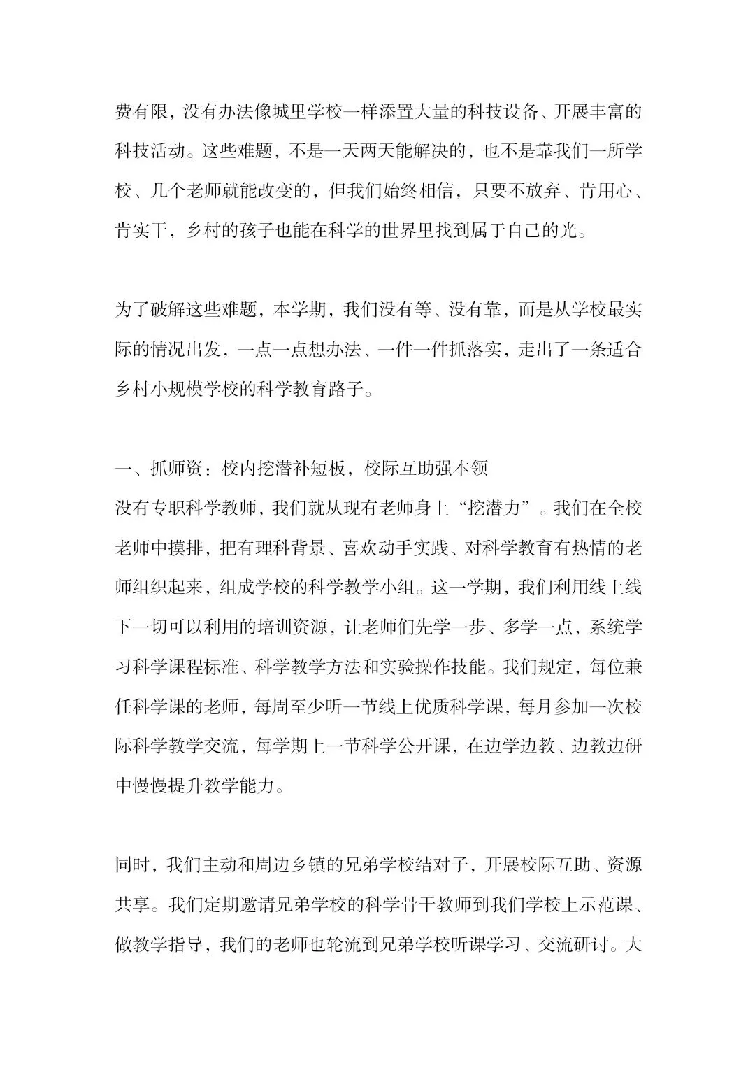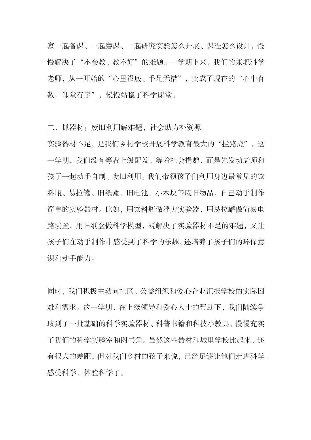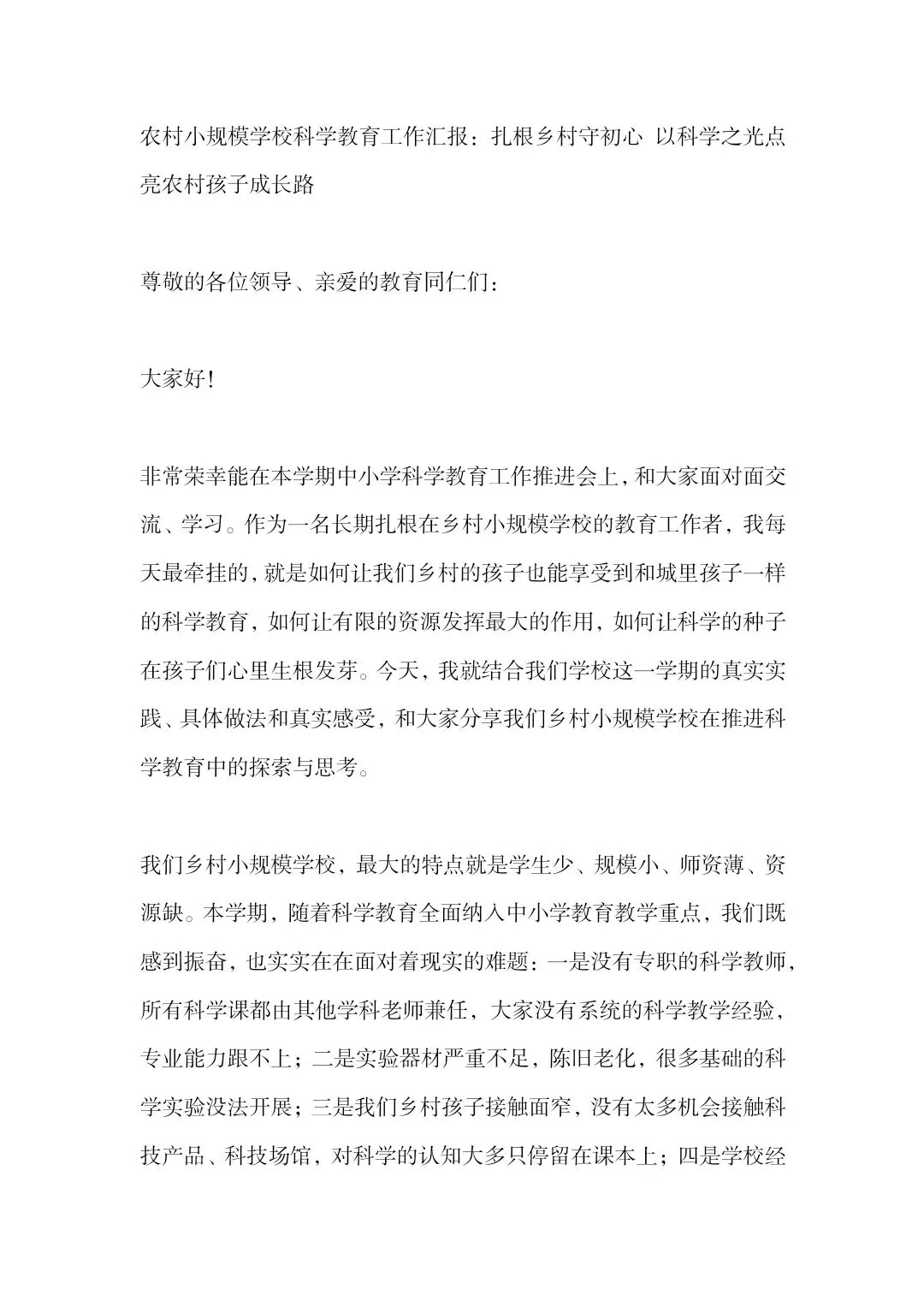 这是农村小规模学校的科学教育工作汇报,该校面临师资薄弱、器材匮乏、学生科学认知浅、经费有限等难题,从四方面破局:校内挖潜+校际互助提升师资能力,废旧利用+社会助力补充实验器材,开发乡土课程、打造田间课堂,开展趣味科学活动激发学生兴趣。学校看到了学生的积极变化,也坦言仍存难题,期盼各界给予经费、培训、资源等方面的支持。