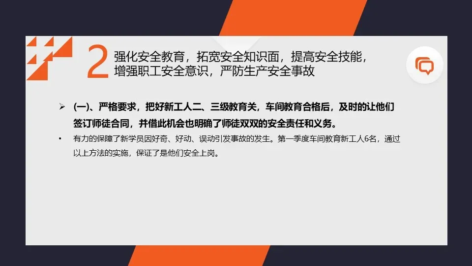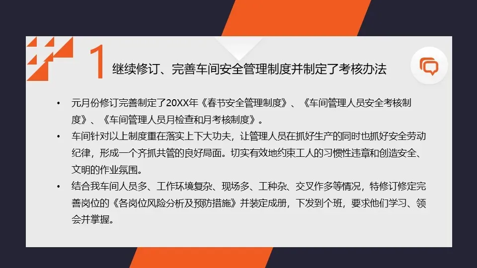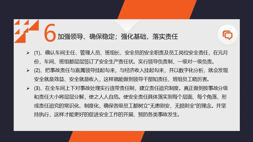 我们进一步完善了企业的安全管理体系,明确了各级安全责任和任务,落实了安全生产责任制。同时,我们还加强了与相关部门之间的沟通与协作,形成了齐抓共管的安全工作氛围。