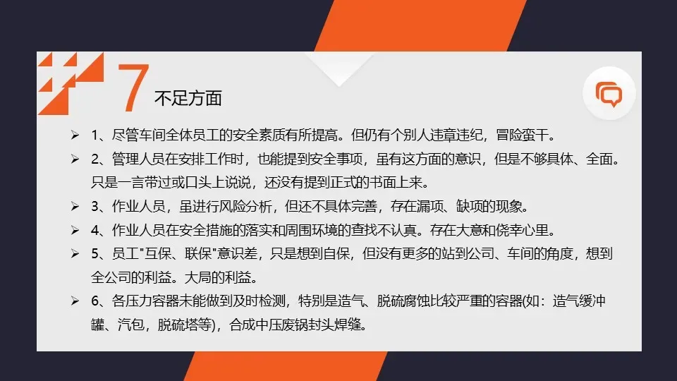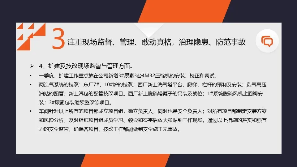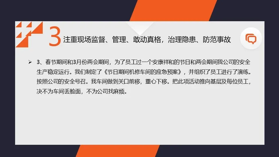 我们加强了对生产现场的安全隐患排查和治理工作,及时发现和整改了一批安全隐患。同时,我们还加强了对危险源的监控和管理,确保了企业的安全生产。
