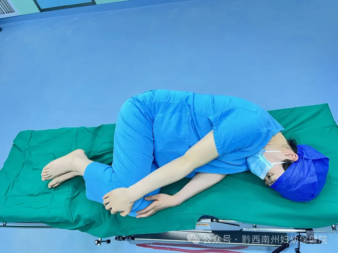 孕产妇侧卧在手术床上,整个身体往床边靠,先挪臀部,肩膀后背向床沿垂直,双腿弯曲向腹部靠近,同时低头,下巴紧贴胸部,双手环抱双膝,呈弓背屈膝侧卧位。简单来说“侧卧、低头、抱膝、看肚子”,整个人摆出的姿势像煮熟的虾一样。