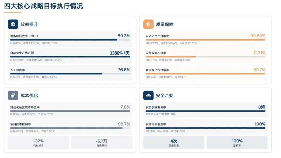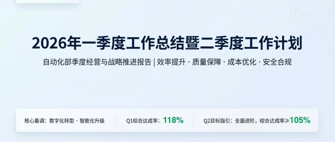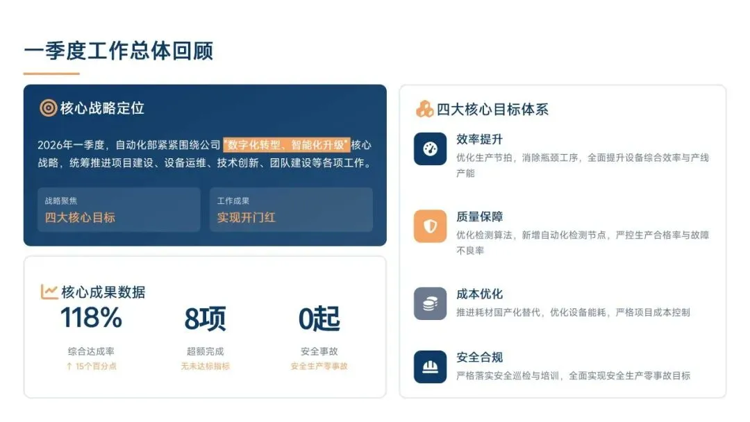 2026年一季度,自动化部紧跟公司数字化转型、智能化升级战略,聚焦效率提升、质量保障、成本优化、安全合规四大目标,统筹项目、运维、技术、团队等工作,核心指标综合达成率118%,10项指标全部达标、8项超额完成,顺利实现一季度“开门红”。