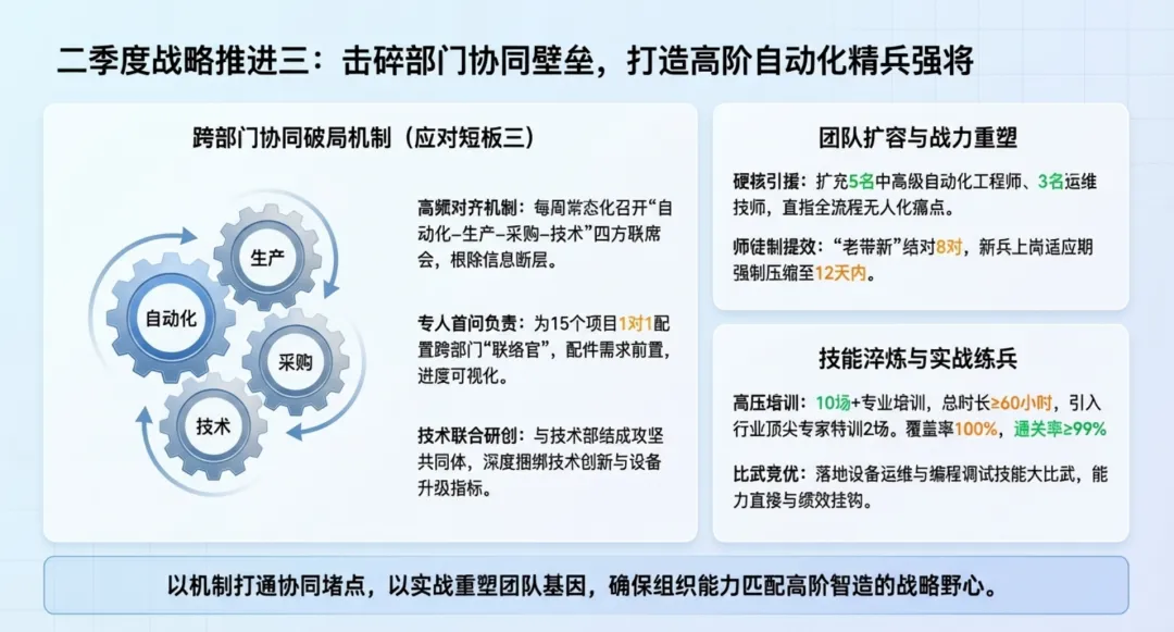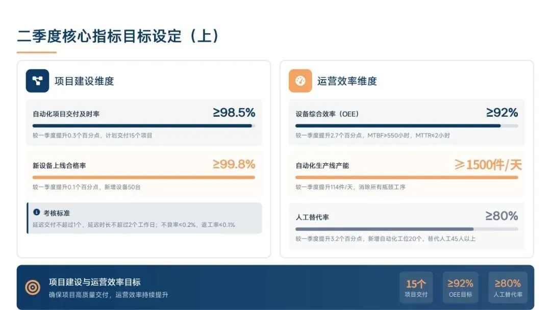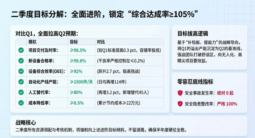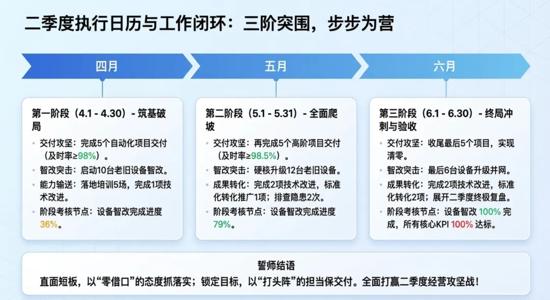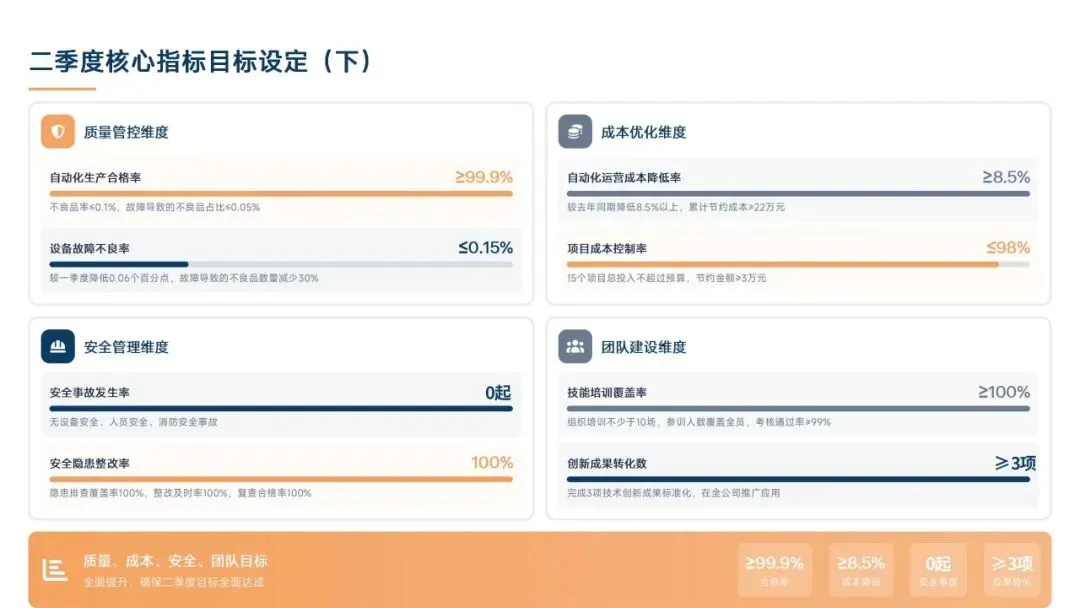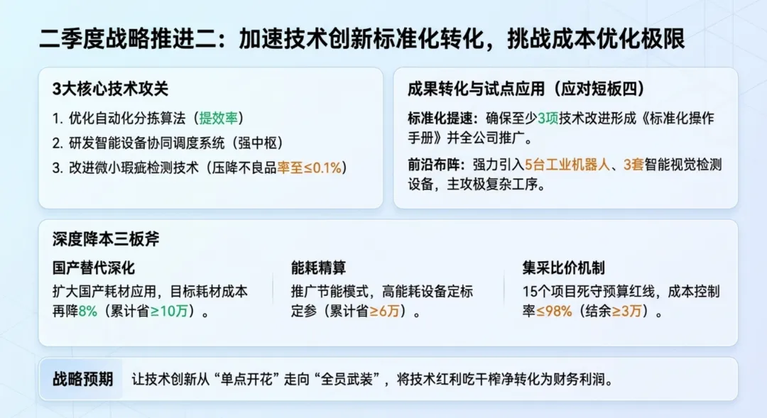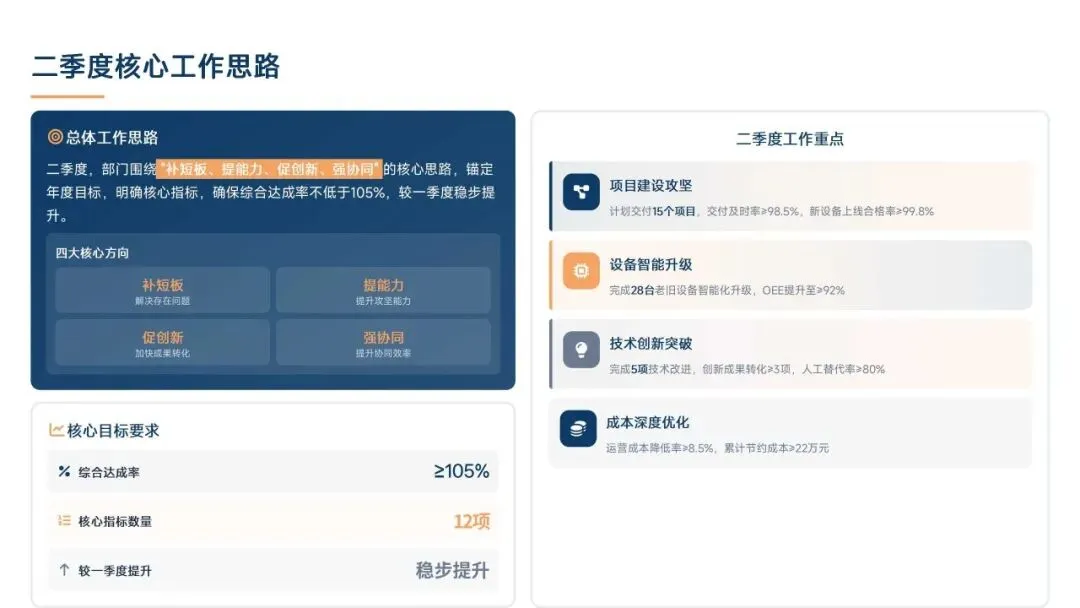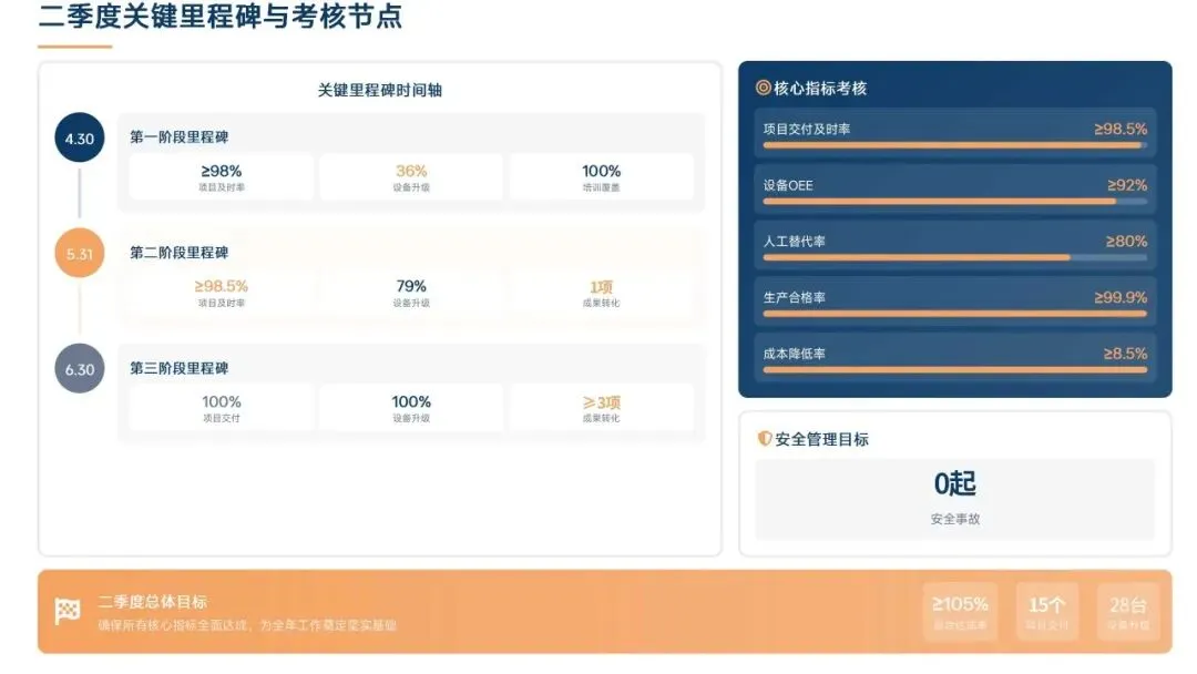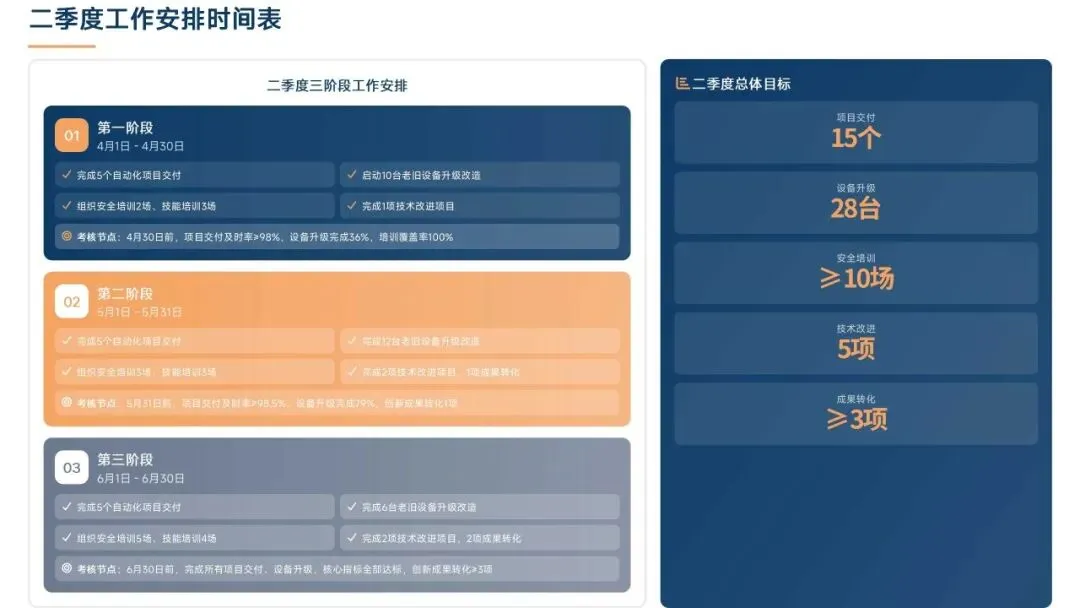 第二季度,围绕“补齐短板、提升能力、推动创新、加强协同”,在确保综合指标达到105%以上的前提下,计划实现自动化项目15个,老设备智能化改造28个,创新成果转化3个,成本控制和安全管理持续加强,团队能力和跨部门合作不断优化,分3个阶段稳步推进。