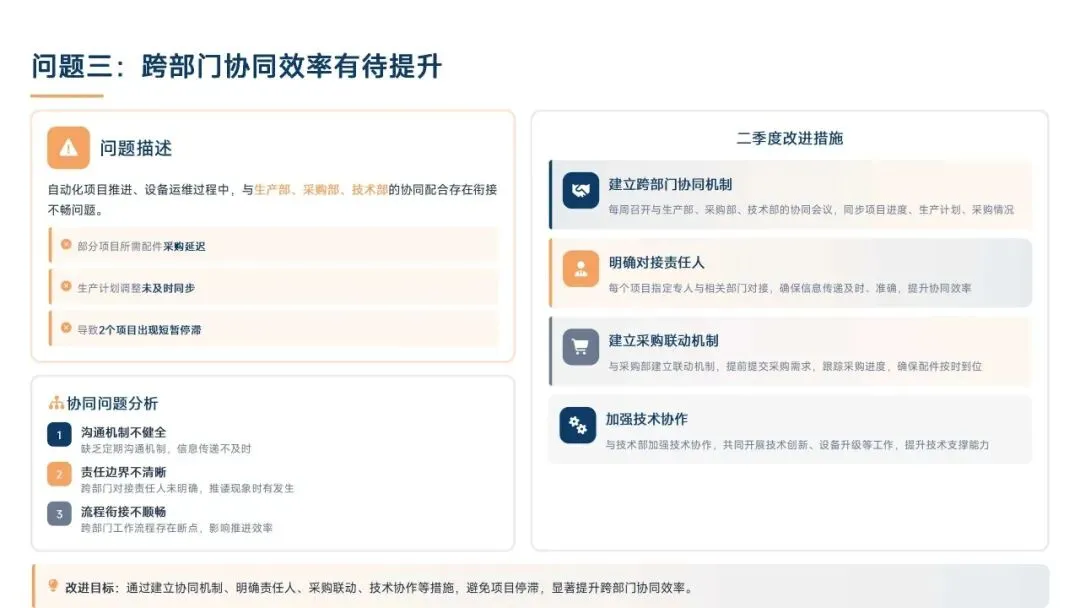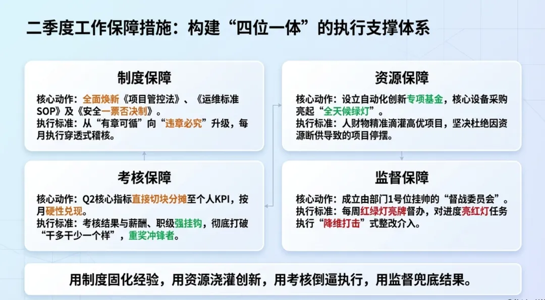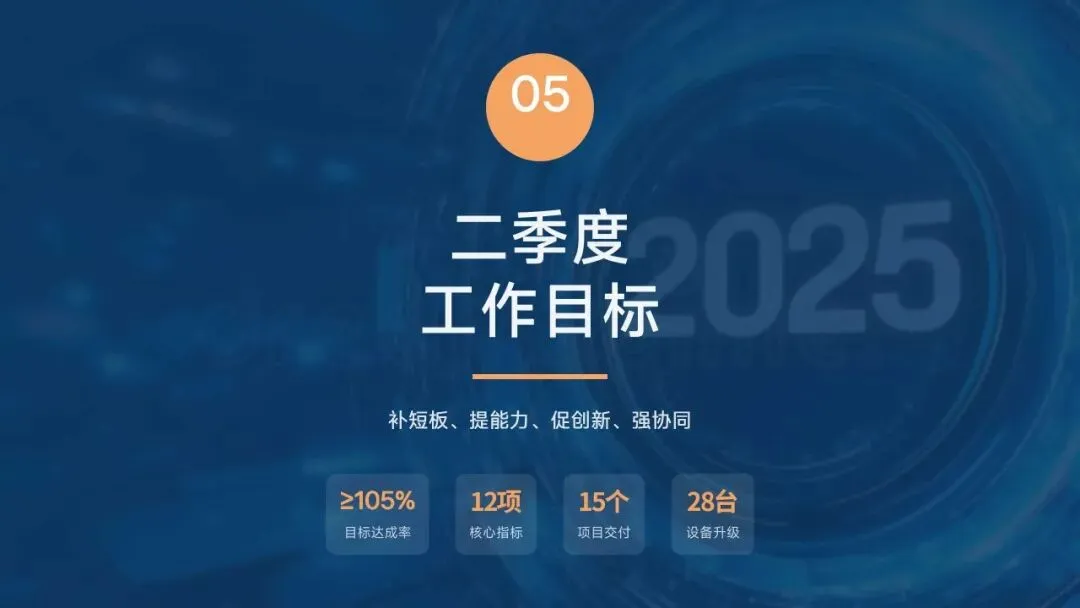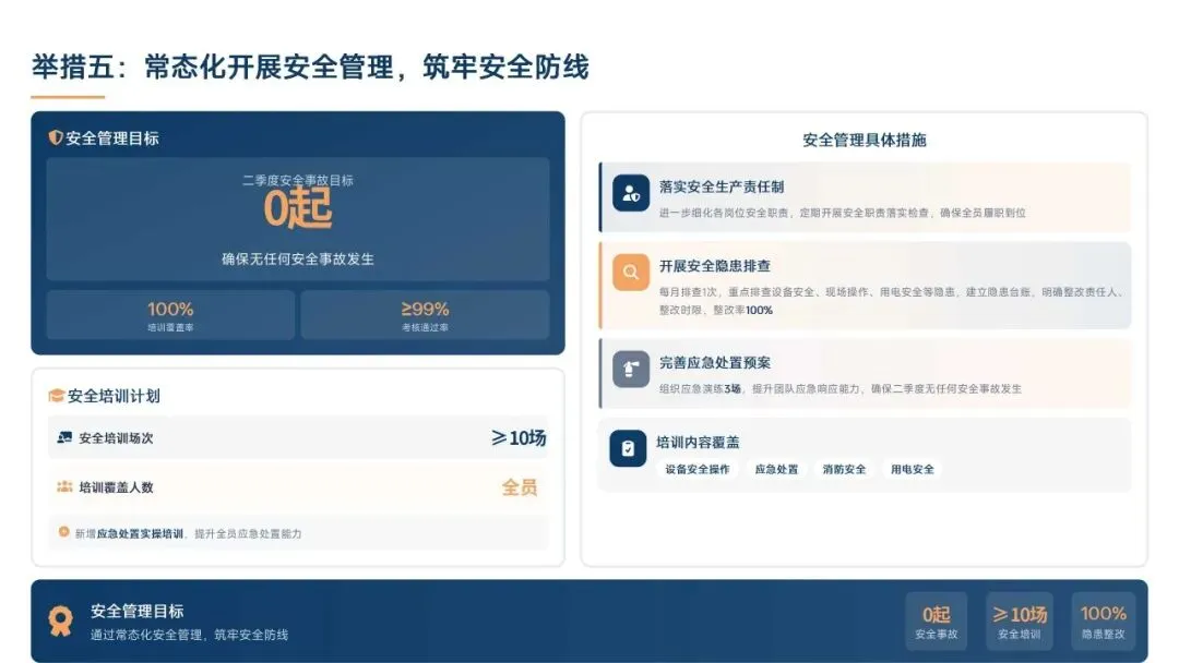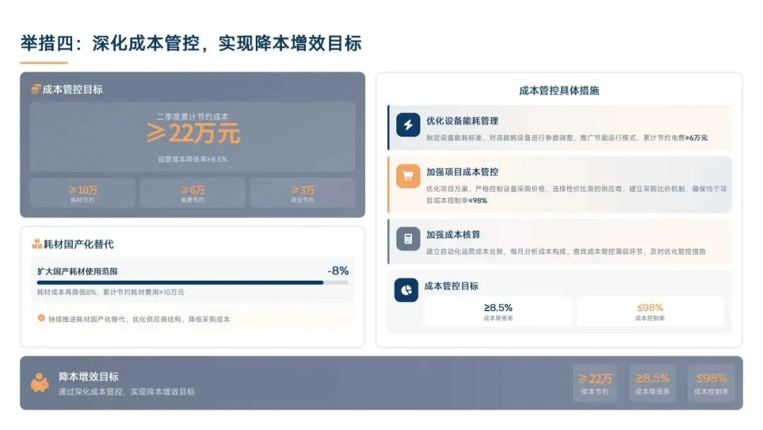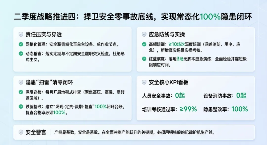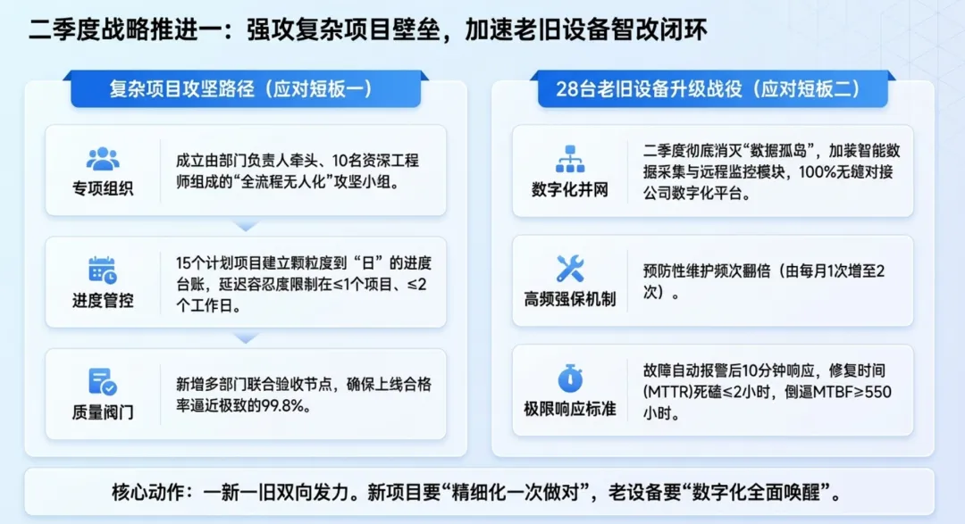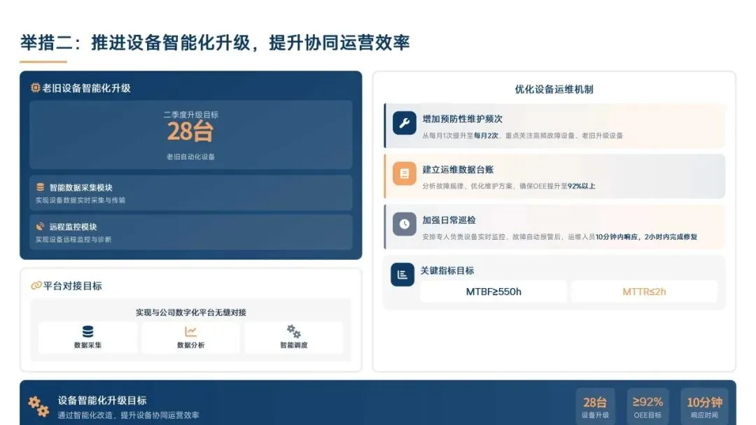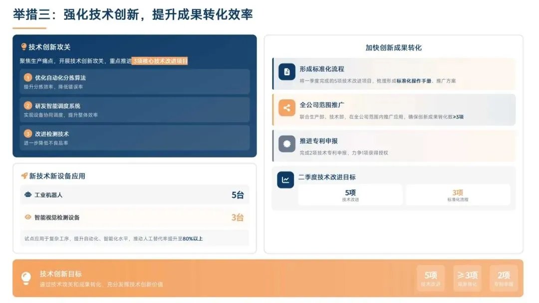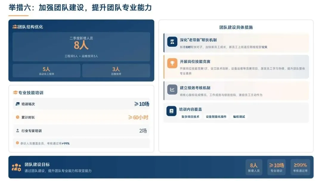 第二季度,围绕“补齐短板、提升能力、推动创新、加强协同”,在确保综合指标达到105%以上的前提下,计划实现自动化项目15个,老设备智能化改造28个,创新成果转化3个,成本控制和安全管理持续加强,团队能力和跨部门合作不断优化,分3个阶段稳步推进。
