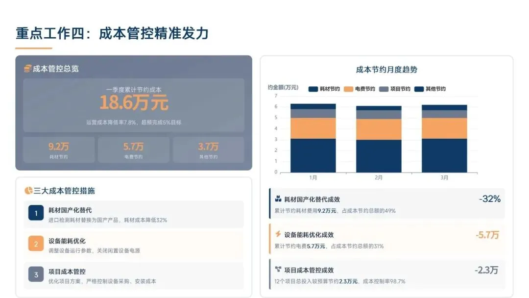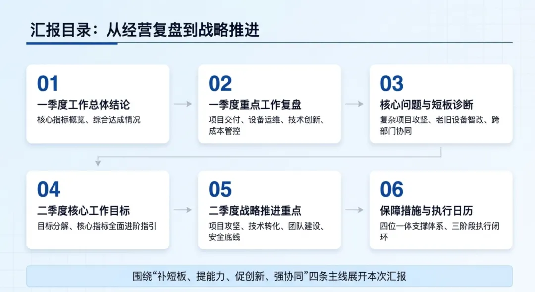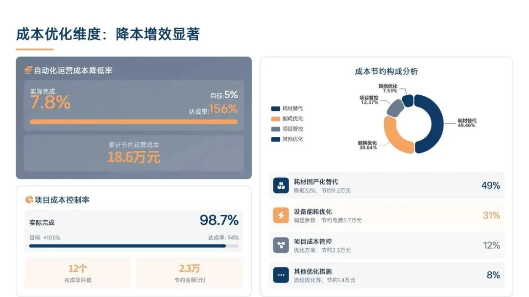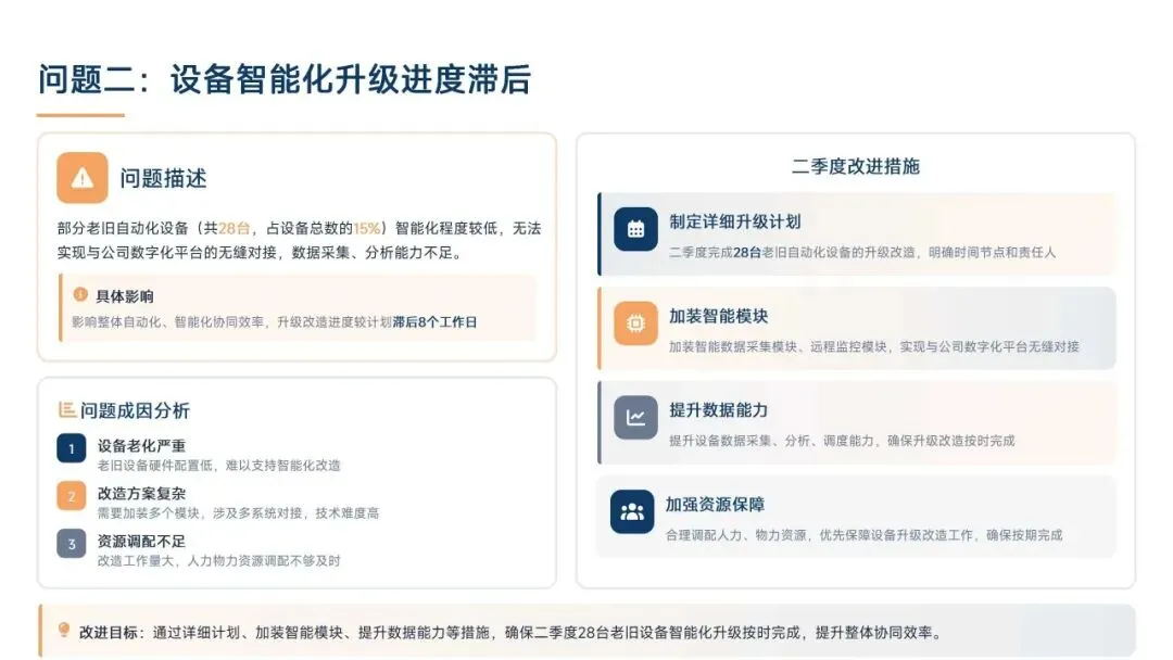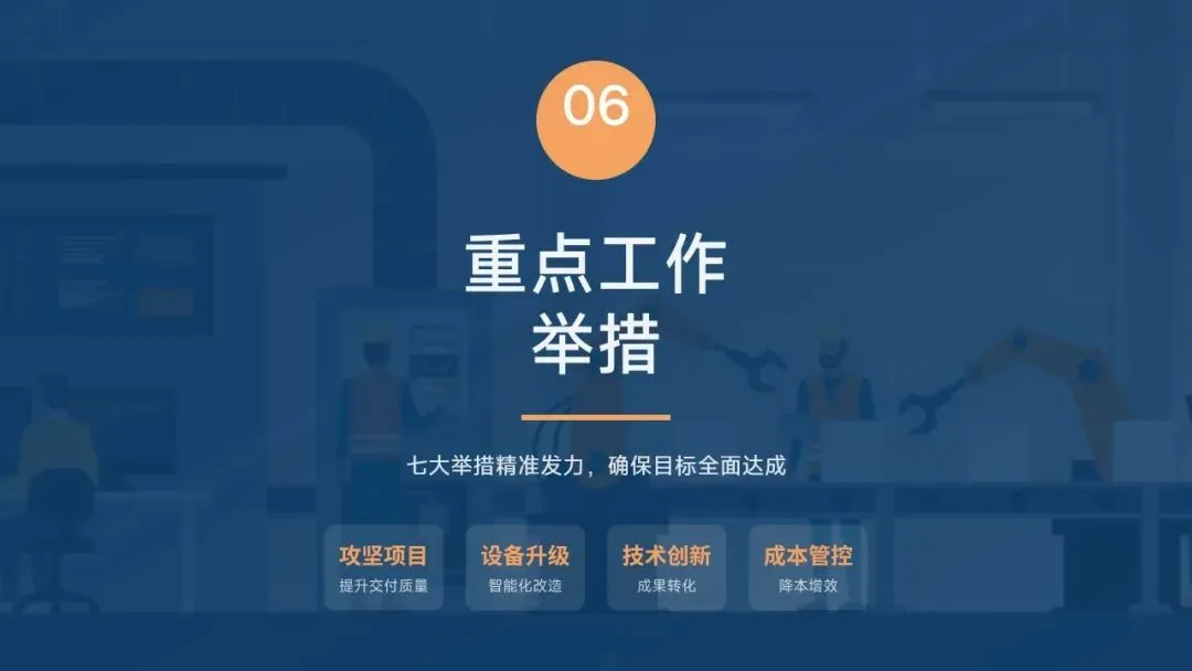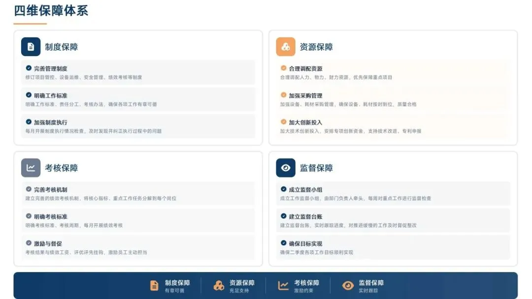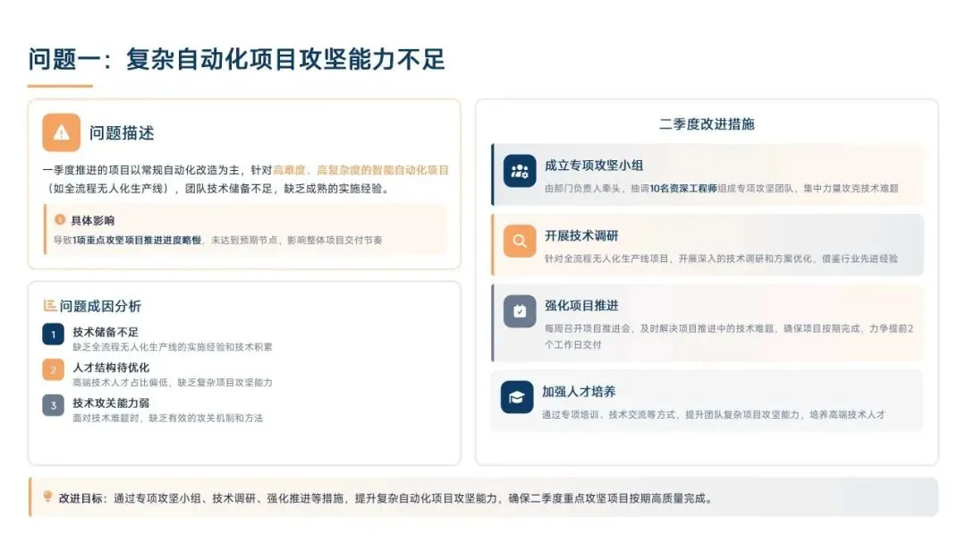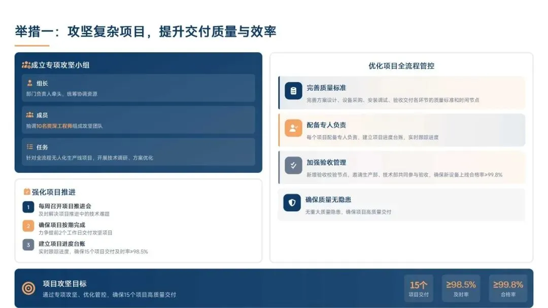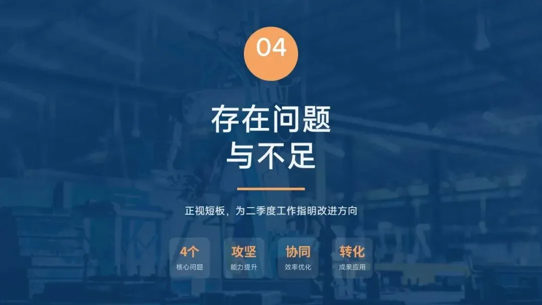 第二季度,围绕“补齐短板、提升能力、推动创新、加强协同”,在确保综合指标达到105%以上的前提下,计划实现自动化项目15个,老设备智能化改造28个,创新成果转化3个,成本控制和安全管理持续加强,团队能力和跨部门合作不断优化,分3个阶段稳步推进。