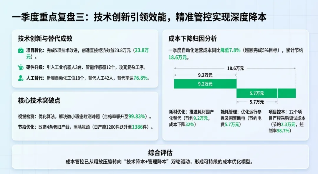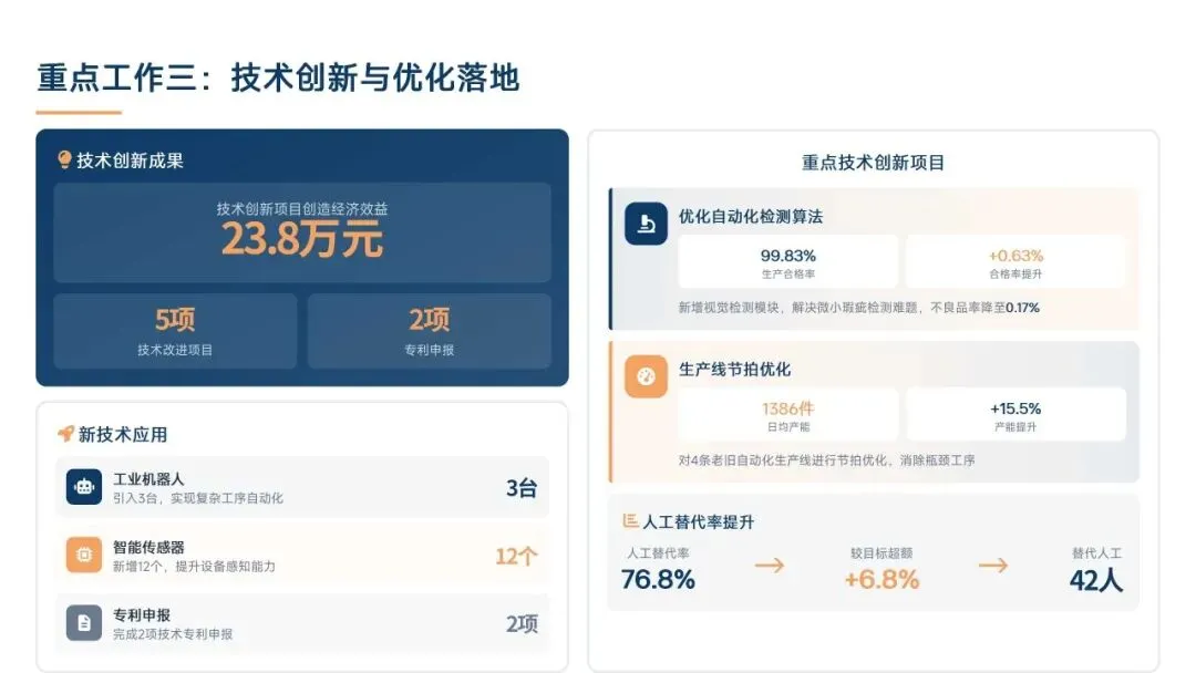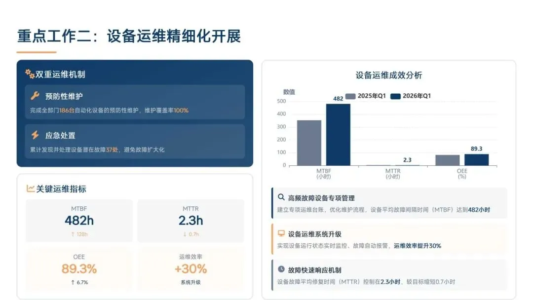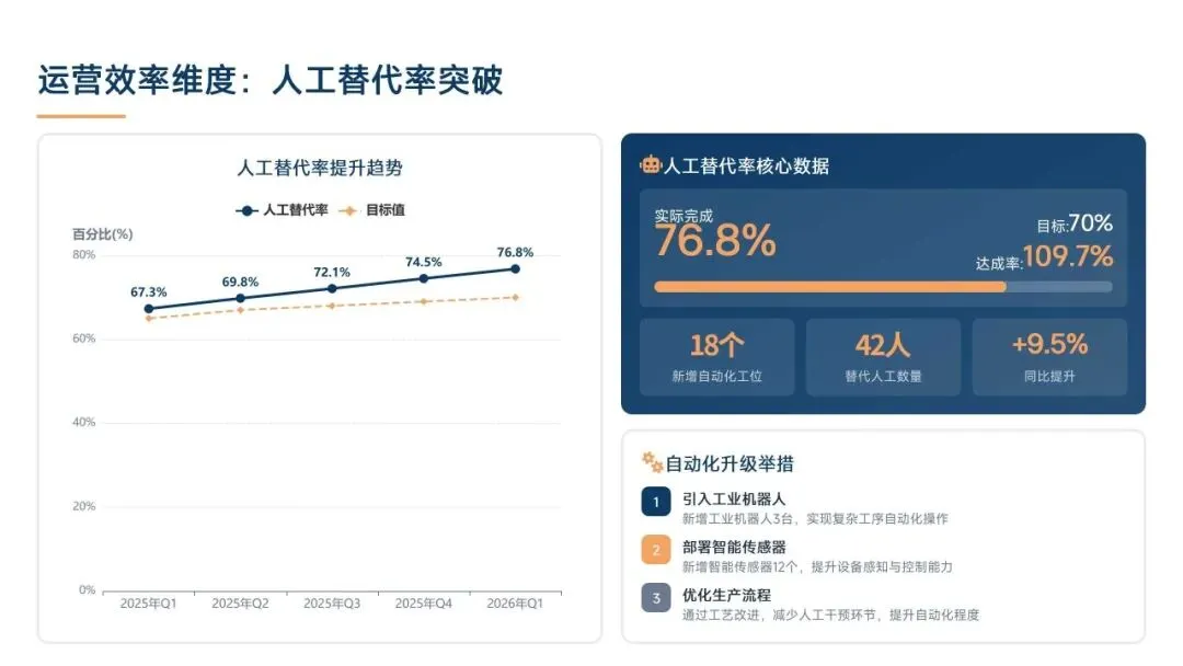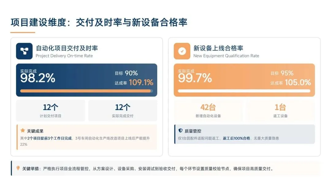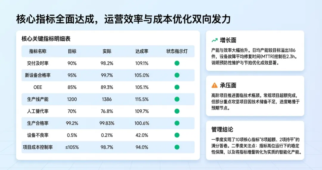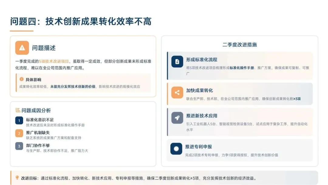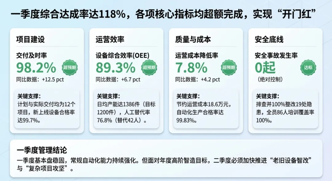 第一季度交付自动化项目12个,按时交付率达到98.2%,设备投产合格率达到99.7%;通过预防性操作和维护,使设备综合利用率达到89.3%,日生产能力达到1386台,人工更换率达到76.8%;生产合格率达99.83%,生产费用下降7.8%,实现了零事故安全生产。同时,完成技术改造5项,申请专利2项,员工队伍扩大到86名,专业素质不断提高。但各部门在攻坚复杂工程能力不足,老旧装备智能化改造滞后,部门间协同合作不足,创新成果转化效率不高等方面还存在不足。