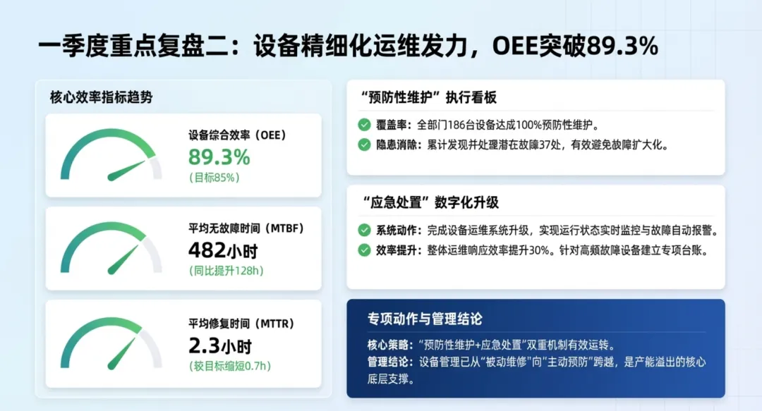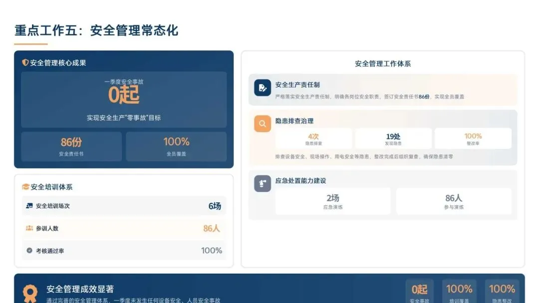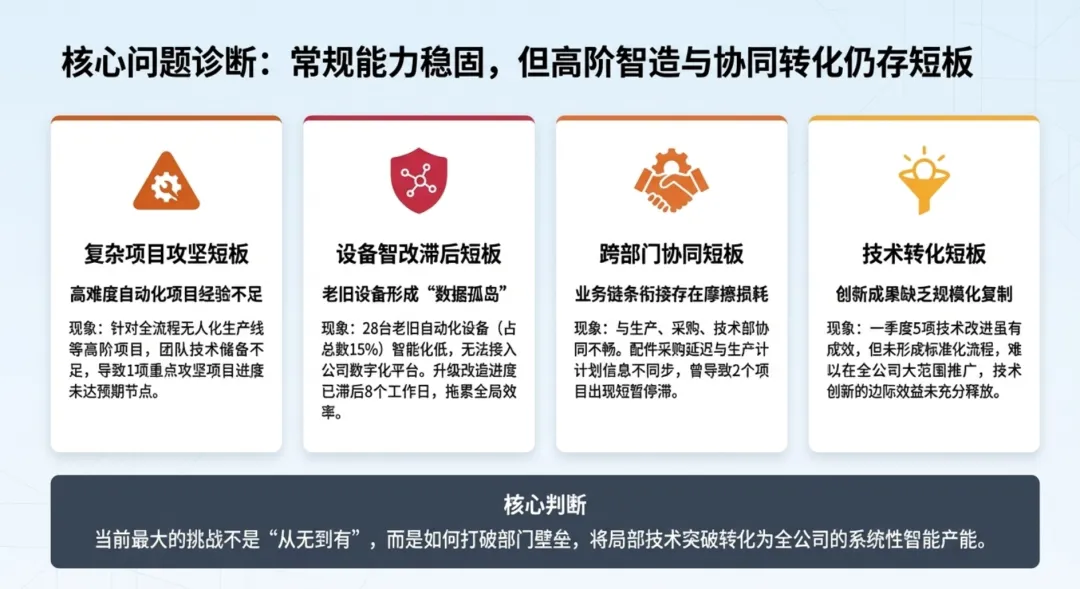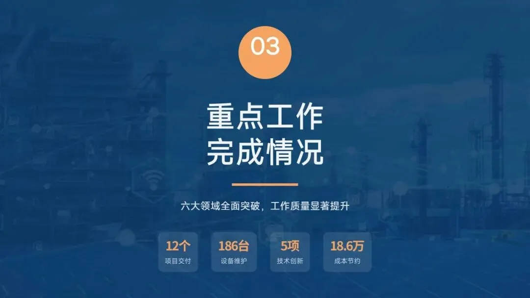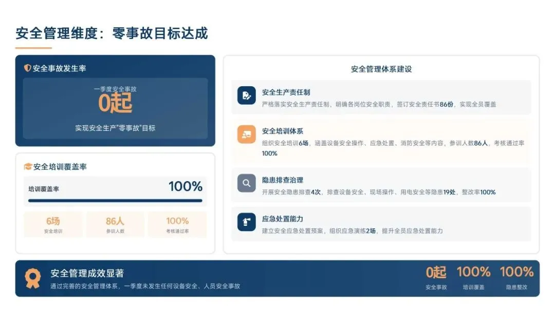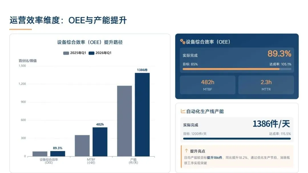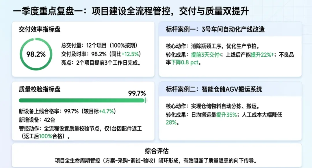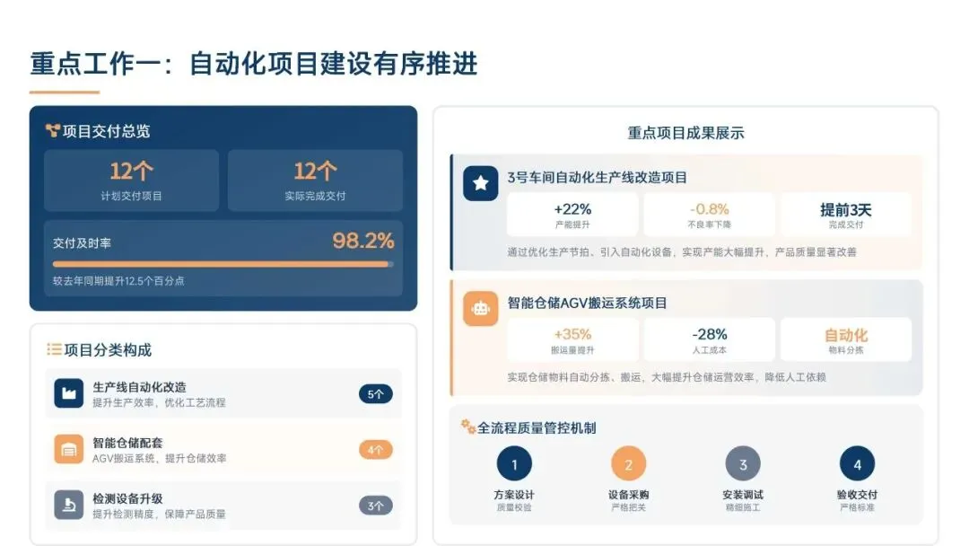 第一季度交付自动化项目12个,按时交付率达到98.2%,设备投产合格率达到99.7%;通过预防性操作和维护,使设备综合利用率达到89.3%,日生产能力达到1386台,人工更换率达到76.8%;生产合格率达99.83%,生产费用下降7.8%,实现了零事故安全生产。同时,完成技术改造5项,申请专利2项,员工队伍扩大到86名,专业素质不断提高。但各部门在攻坚复杂工程能力不足,老旧装备智能化改造滞后,部门间协同合作不足,创新成果转化效率不高等方面还存在不足。