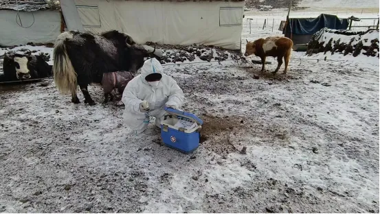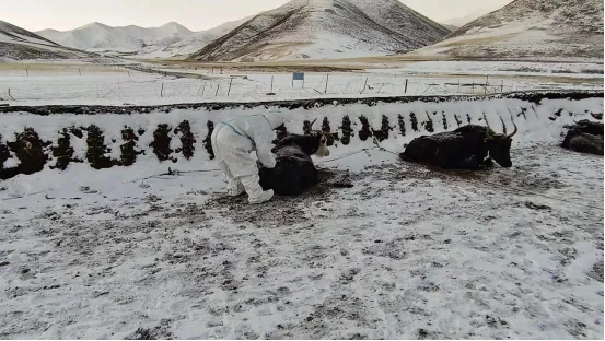 3月26日,满掌乡防疫员为辖区内牦牛注射口蹄疫 O型、A型二价灭活疫苗及牛病毒性腹泻疫苗。