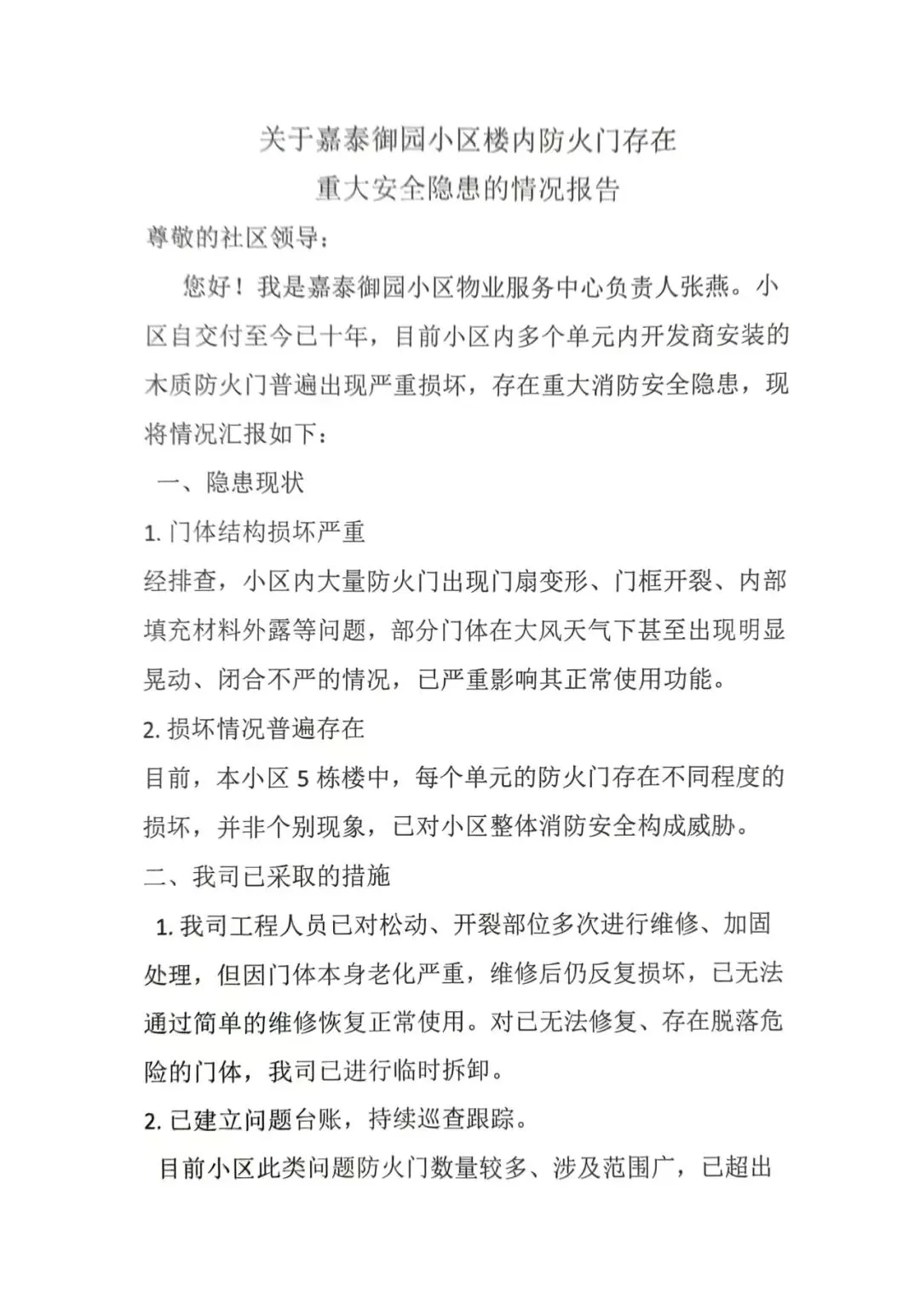 消防安全无小事,隐患排查不松懈。为切实保障小区全体业主的生命财产安全,严守消防安全底线,3月对小区内所有楼栋的防火门开展全面专项排查工作,经细致检查,发现多处防火门存在不同程度损坏,已影响正常消防防护功能, 向跃进里社区上报相关情况,恳请社区予以关注并协助推进整改工作。