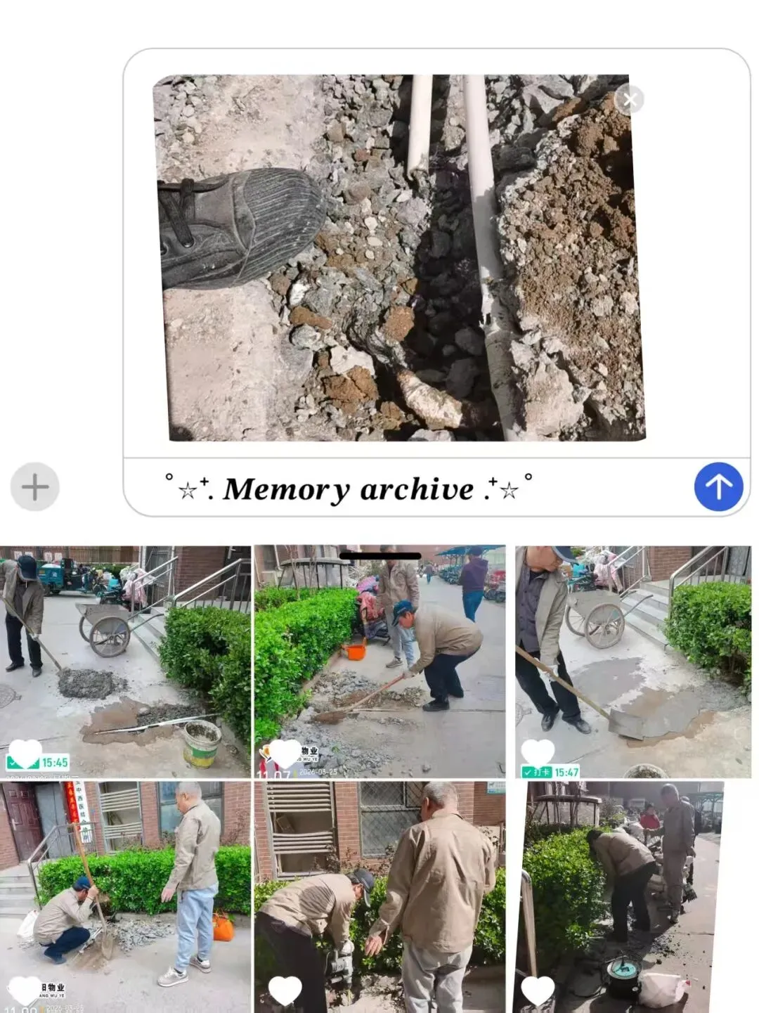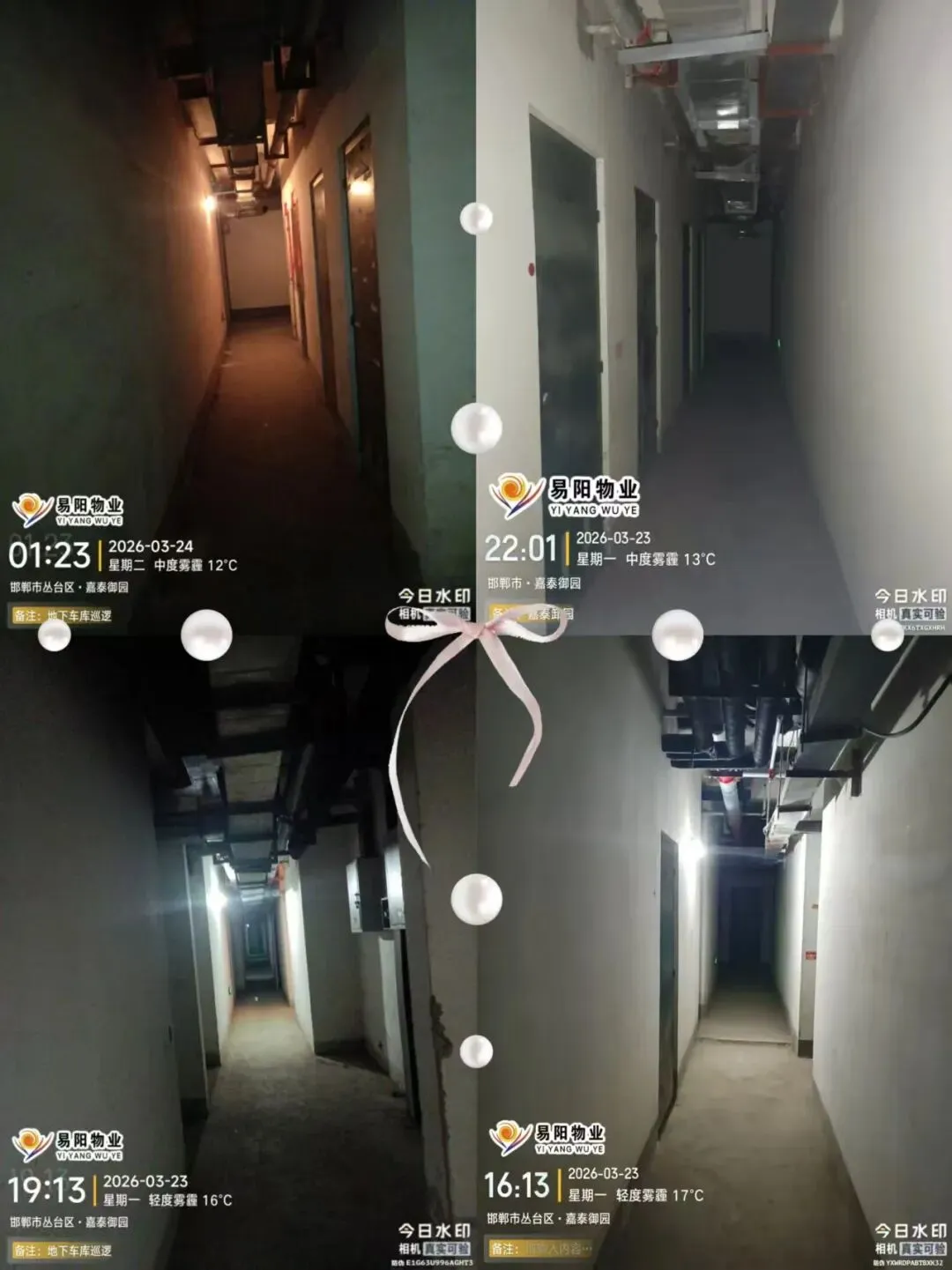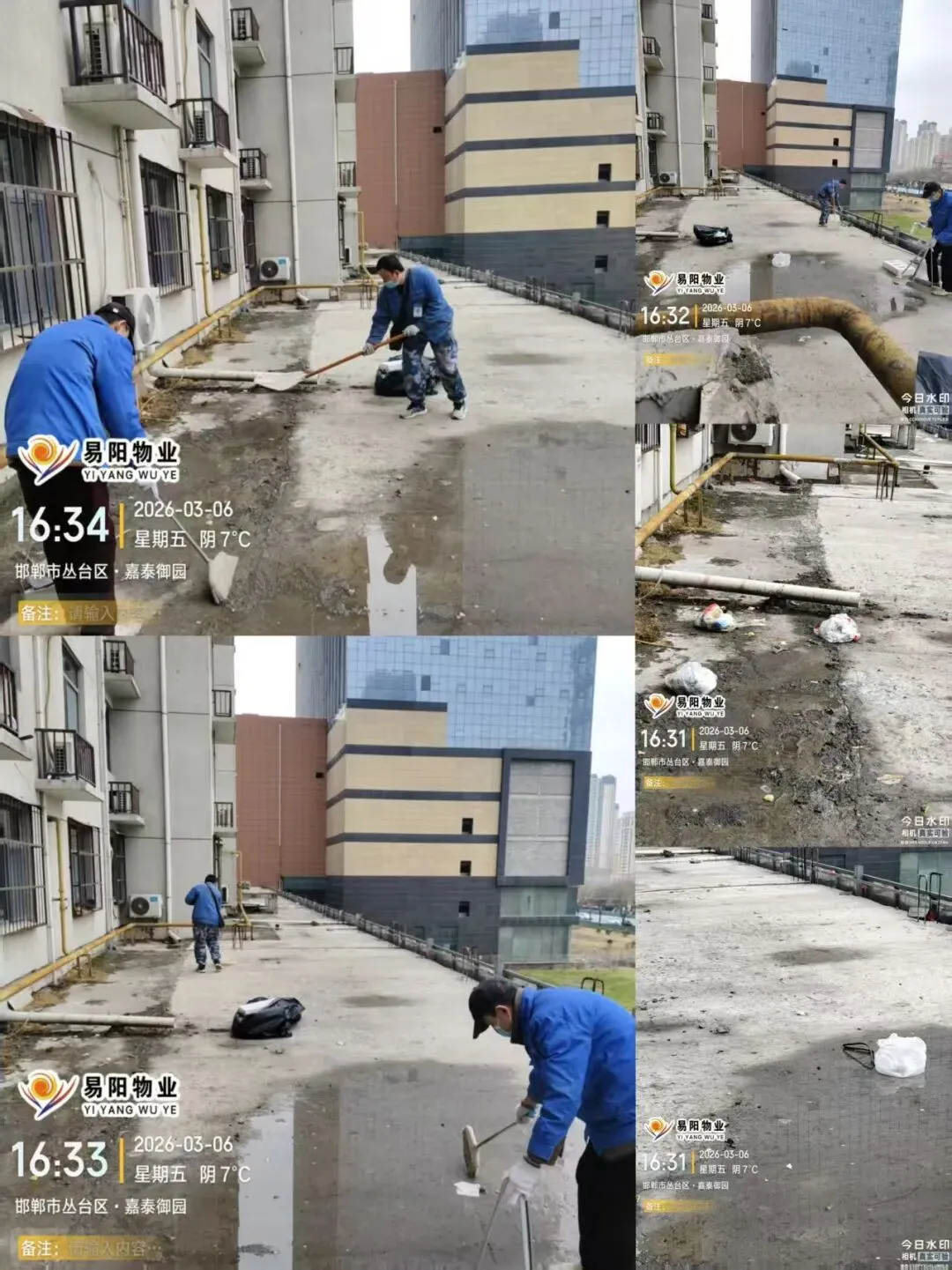 每天进行小区巡查地库、楼栋、天台、夜间巡视大院、监控随时查看水位、制止绿化遛狗、清理业主不要的消防通道杂物及建筑垃圾等等工作。