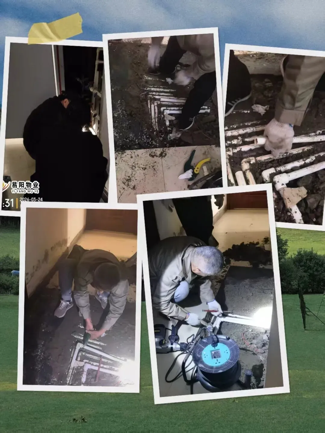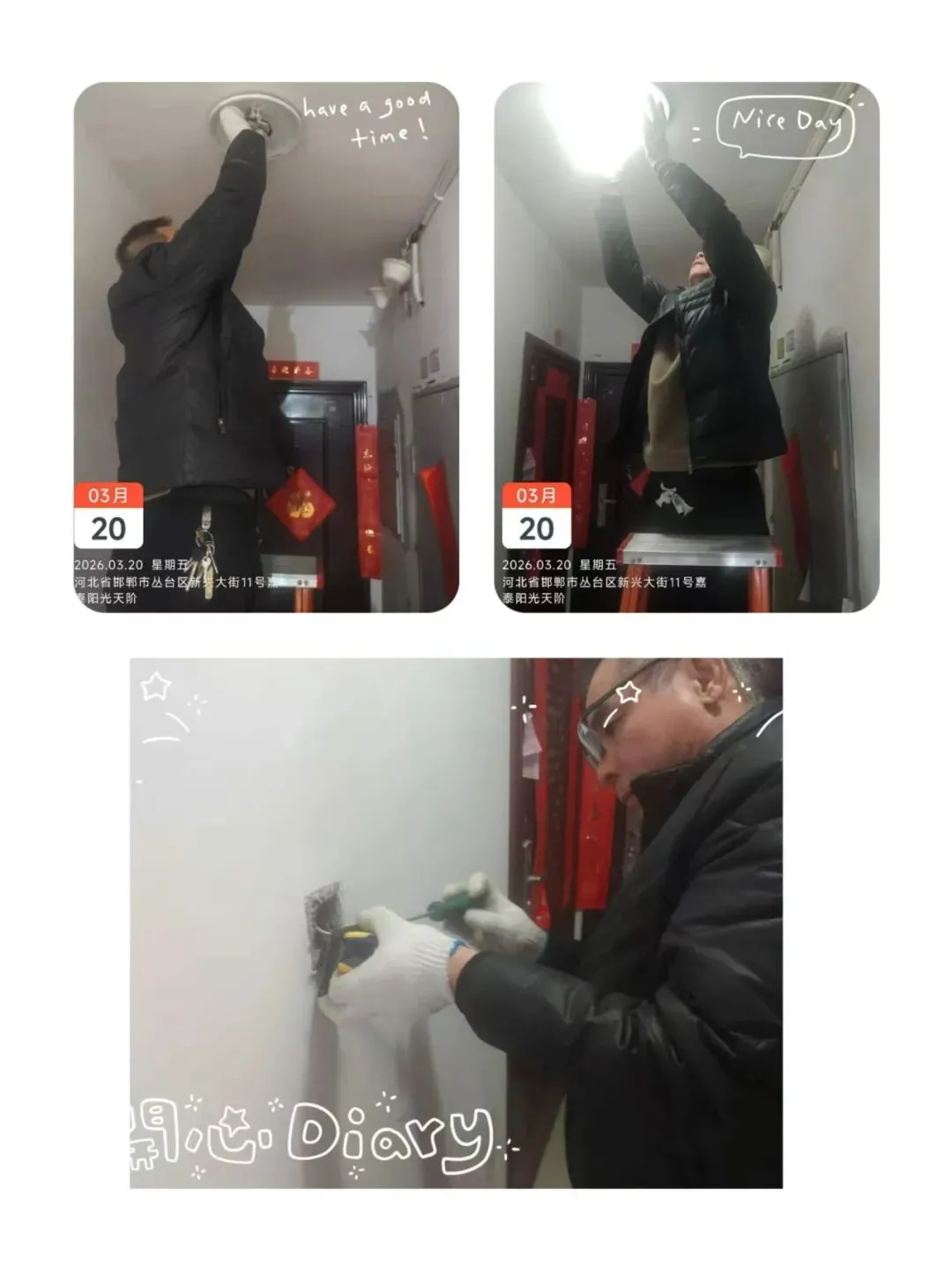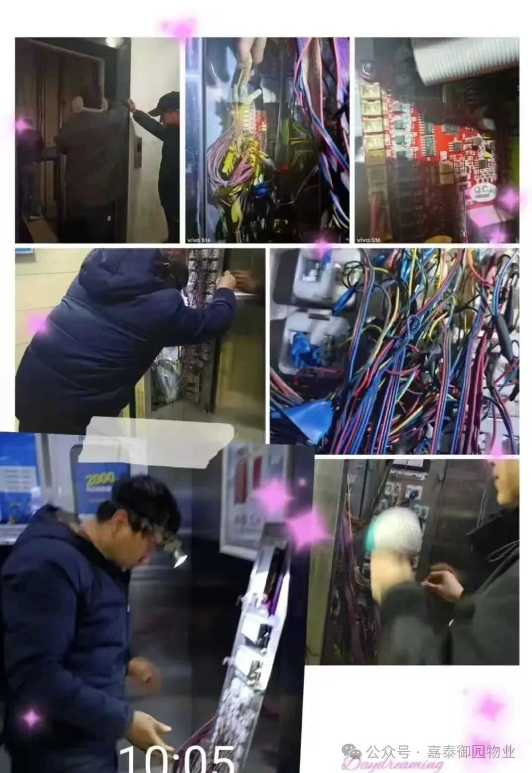 工程部的师傅们每天奋斗在一线,接到维修单就迅速维修,防火门维修、线路维修、更换公共区域的声控灯、巡视水泵房等等工作。