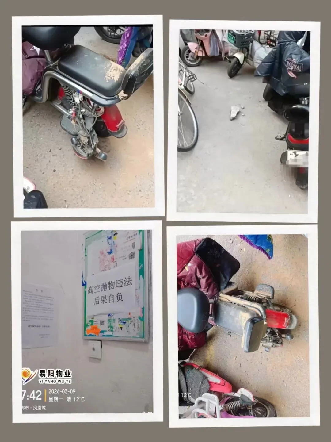 安全是社区生活的底线。三月发生了一起令人后怕的安全隐患事件:五号楼四单元发生高空抛物,一袋石土从高空坠落,直接将楼下停放的电动车砸出了一个大坑。万幸的是,当时没有人员经过,未造成人身伤害。物业经理第一时间赶到现场查看情况,配合警方,对受损车辆进行了协调和妥善处理,客服人员张贴温馨提示,提示业主规范行为,避免不必要的损失。在此,我们再次郑重呼吁广大业主:高空抛物不仅是不文明行为,更是悬在头顶的“隐形杀手”。请大家为了自己和他人的安全,坚决杜绝高空抛物,共同维护文明和谐的居住环境。