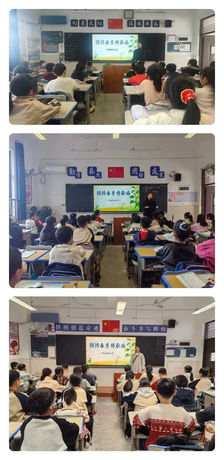 3月27日,广信区第九小学组织各班级召开了预防春季传染病主题班会。班会上,老师们通过知识讲解、案例分享、互动问答等形式,向学生普及春季常见传染病的传播途径与预防措施,引导学生养成良好的卫生习惯,增强自我防护意识,筑牢校园健康防线。