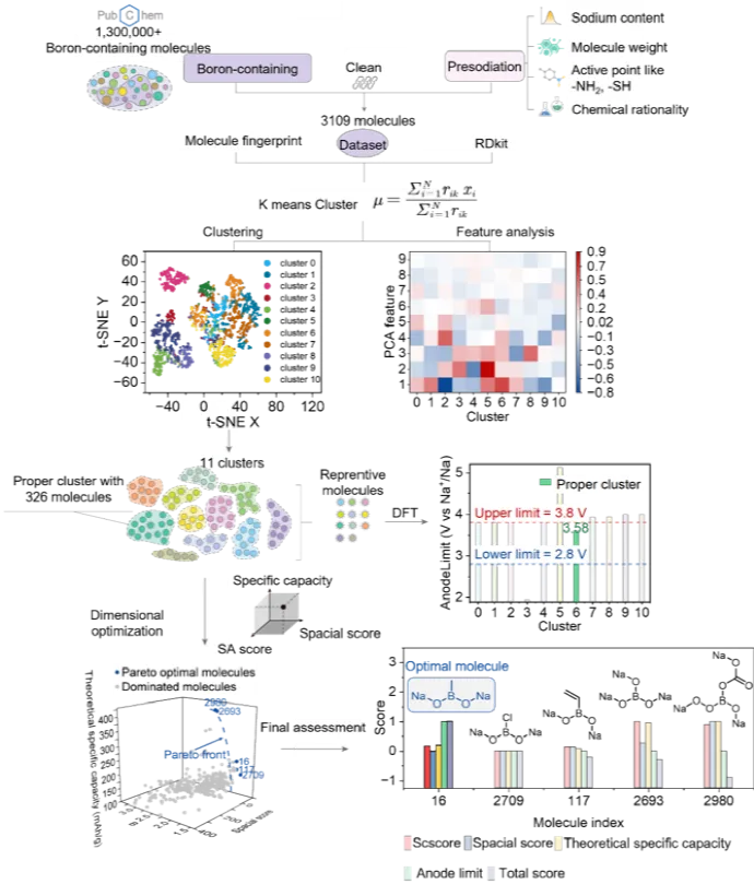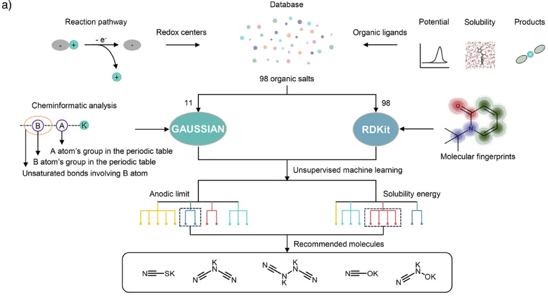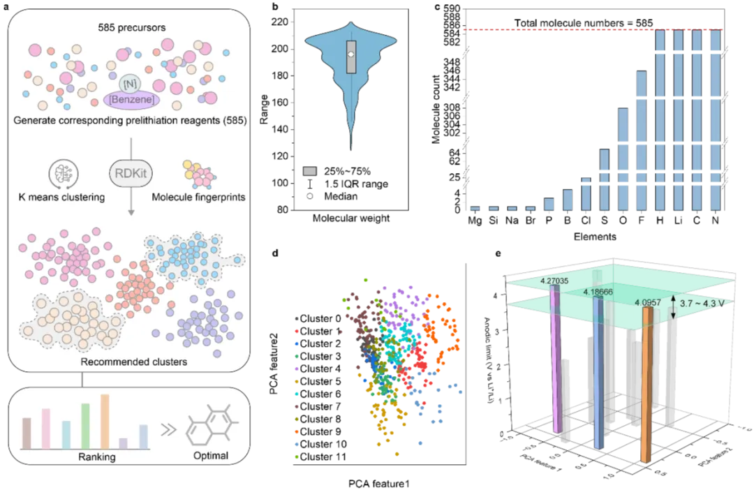 针对钾离子电池活性钾严重短缺的瓶颈,团队提出“无损伤电解液补钾”策略。运用无监督机器学习与化学信息学方法,构建22维分子描述符体系,通过层次聚类从98个分子中优选硫氰酸钾(KSCN)。该盐在约3.6 V电位下分解释放活性钾,其配体二聚生成的(SCN)2更可促进钾离子脱溶剂化,在硬碳|K0.5Mg0.15[Mn0.8Mg0.05]O2软包电池中实现容量提升约三倍,突破钾离子短缺的技术壁垒。