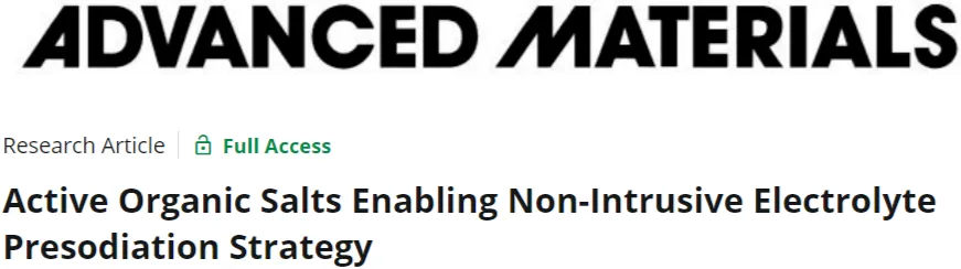 文献详情:Chen, S., Wu, G., Wang, P, et al. Active Organic Salts Enabling Non-Intrusive Electrolyte Presodiation Strategy. Adv. Mater. 2025, 37, 2502251