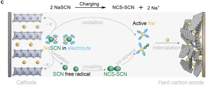 团队通过化学信息学与无监督机器学习协同筛选,从120个候选分子中发掘硫氰酸钠(NaSCN),开创无损伤电解液预钠化新路径。该盐在3.3–4.0 V窗口内不可逆氧化,释放钠离子同时生成NCS-SCN共溶剂,全程无有害残留。在硬碳|P2-Na2/3Ni1/3Mn1/3Ti1/3O2软包电池中,首效从80.8%跃升至95.2%,为钠离子电池实用化注入强劲动力。