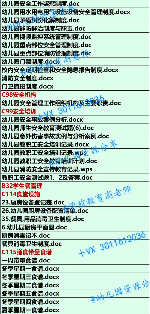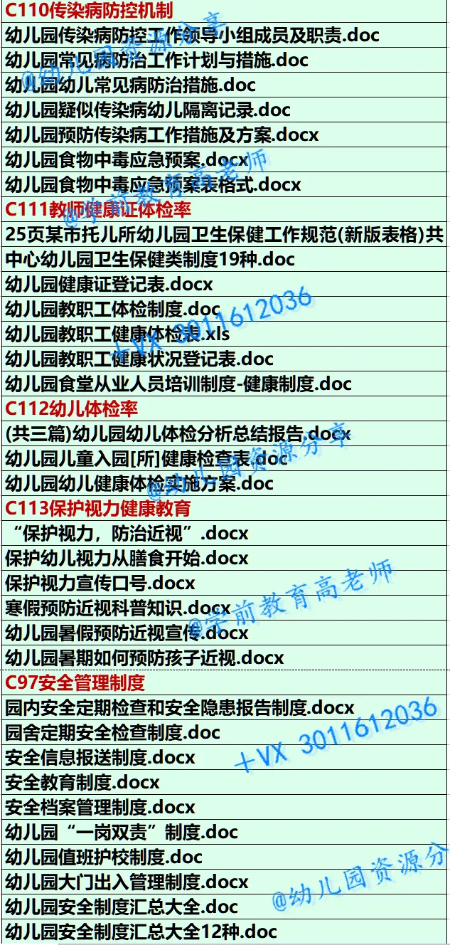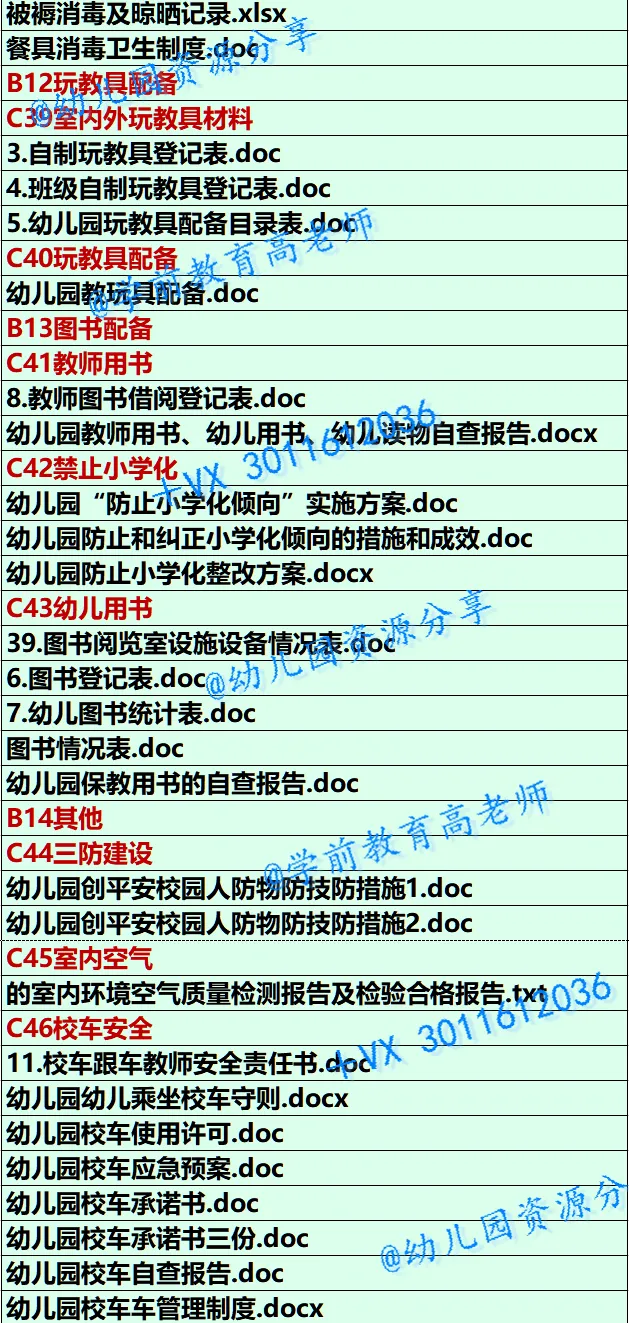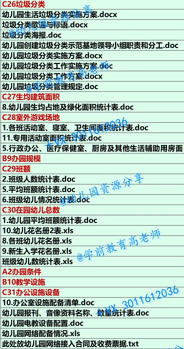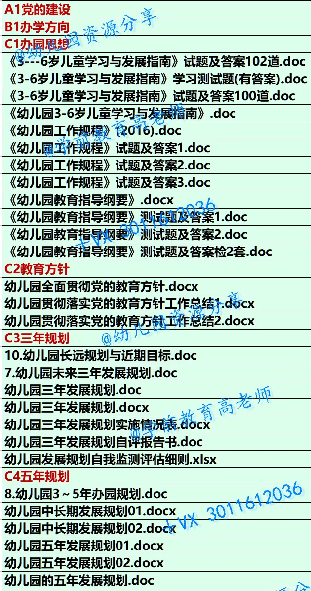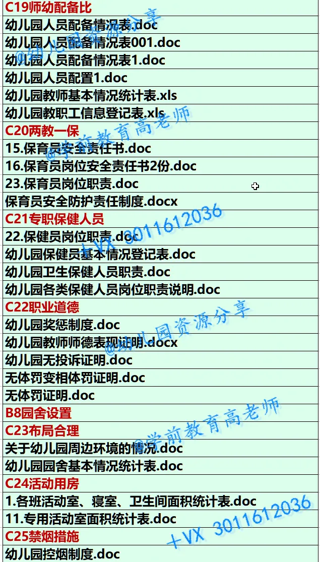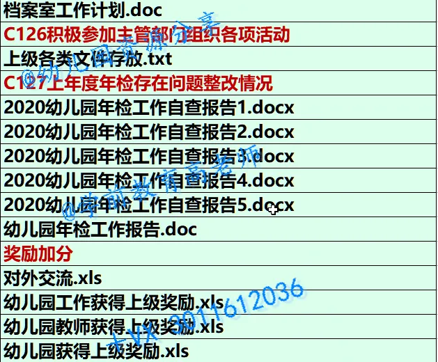 本套资料根据幼儿园年检细则整理而成,分A1党的建设—A2办园条件—A3依法治园—A4财务资产管理—A5办学行为—A6教师权益—A7日常管理—A8奖励加分 八大板块共863个文档,170个文件夹,很全面的一套资料!欢迎试看,咨询!对幼儿园年检具有很强的参考和学习价值。@+VX 3011612036