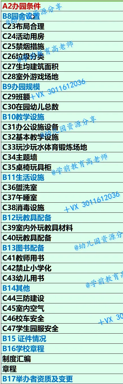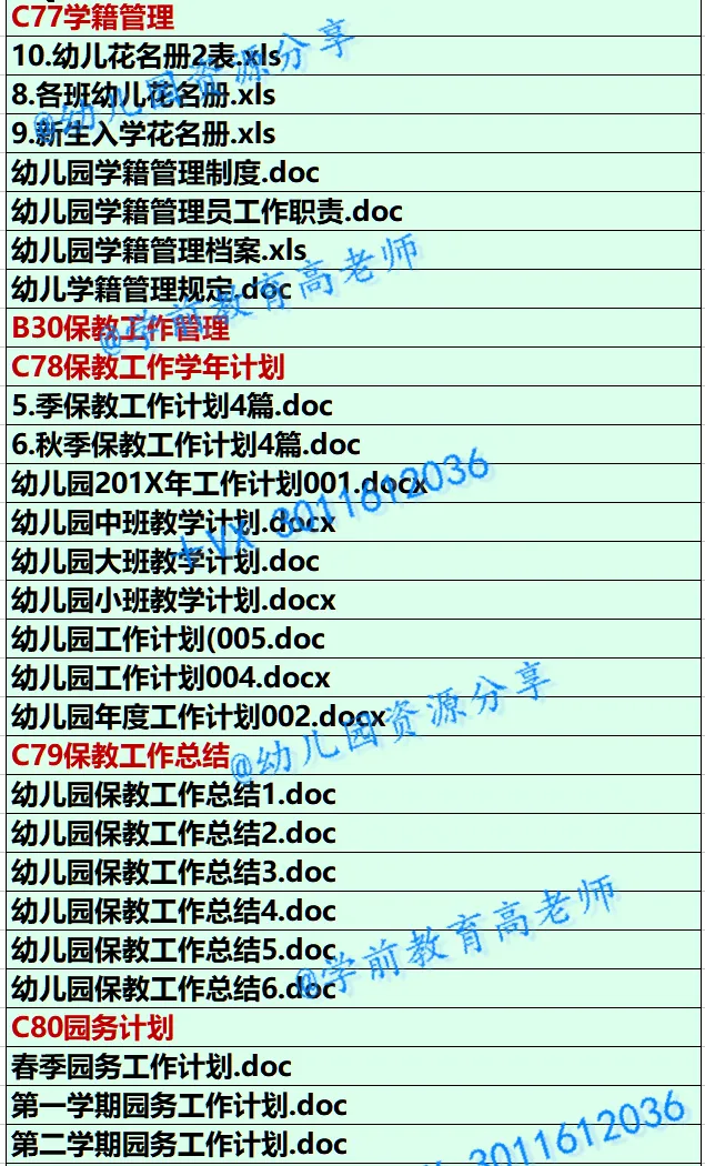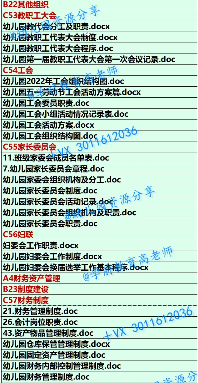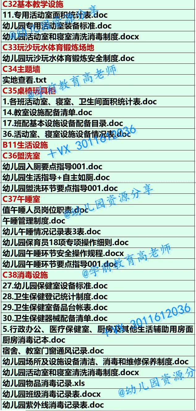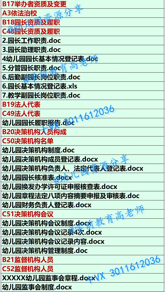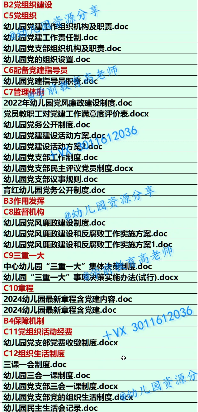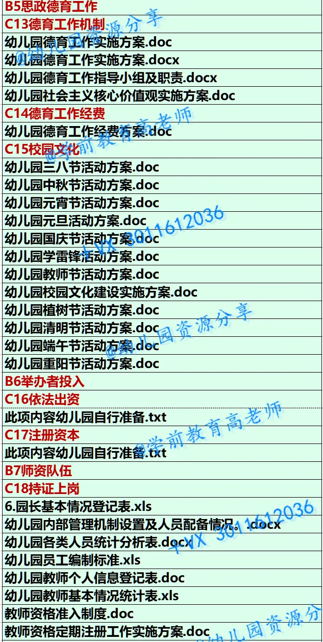 本套资料根据幼儿园年检细则整理而成,分A1党的建设—A2办园条件—A3依法治园—A4财务资产管理—A5办学行为—A6教师权益—A7日常管理—A8奖励加分 八大板块共863个文档,170个文件夹,很全面的一套资料!欢迎试看,咨询!对幼儿园年检具有很强的参考和学习价值。@+VX 3011612036