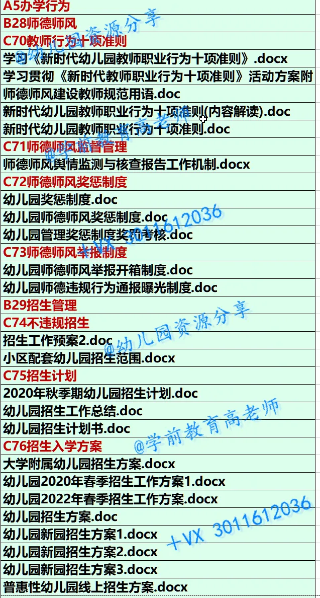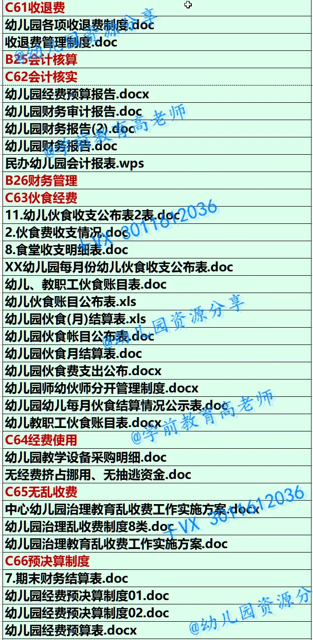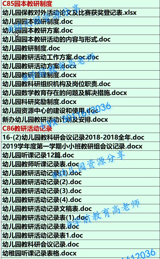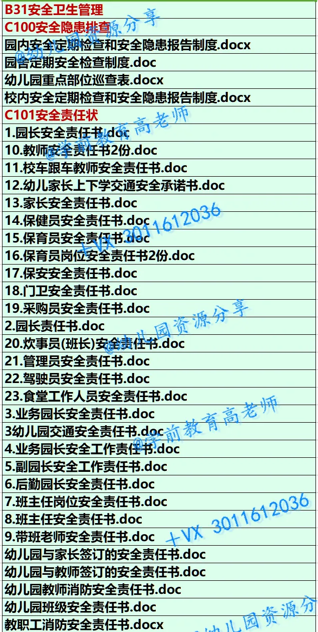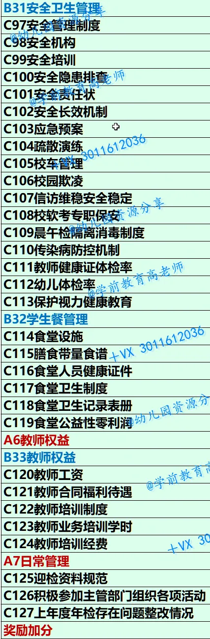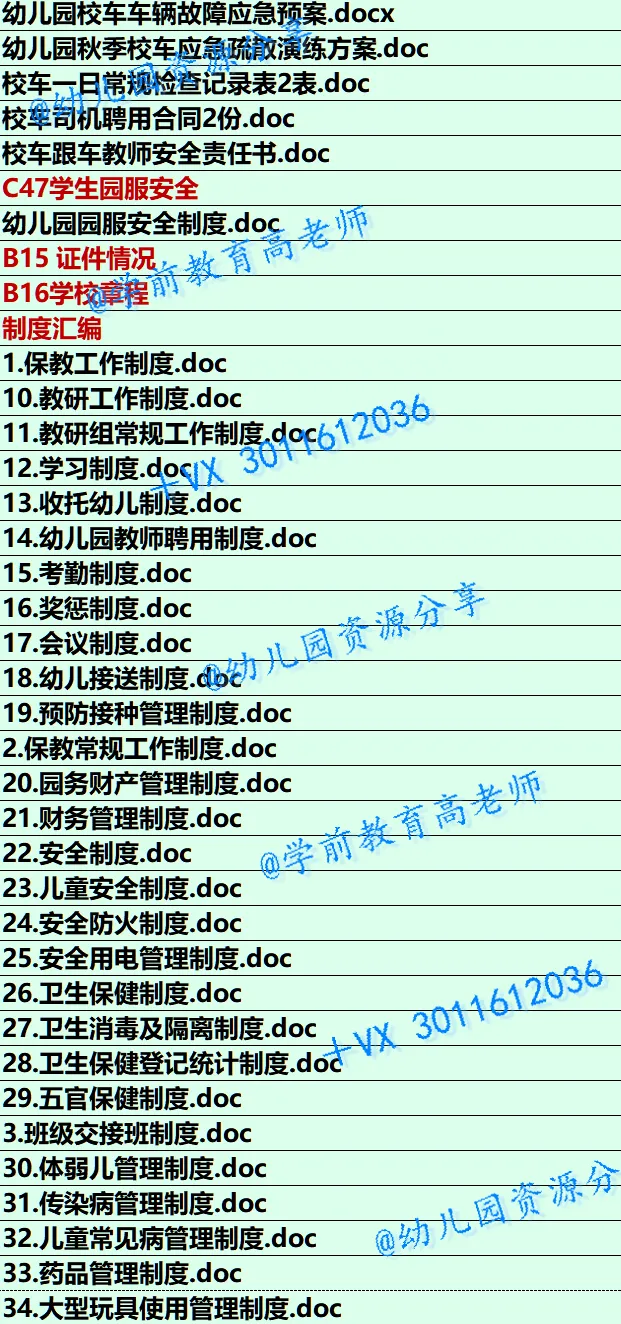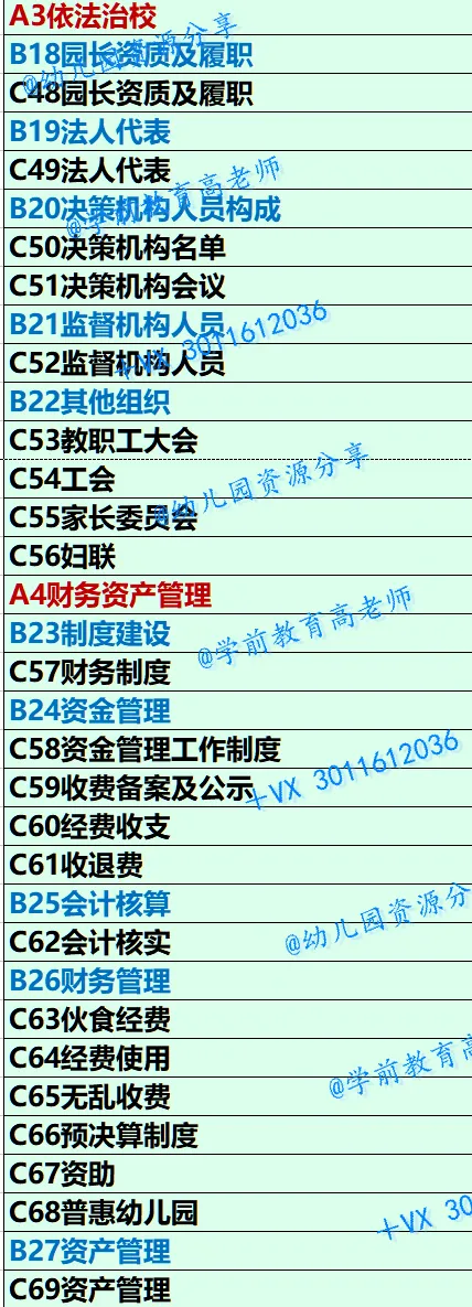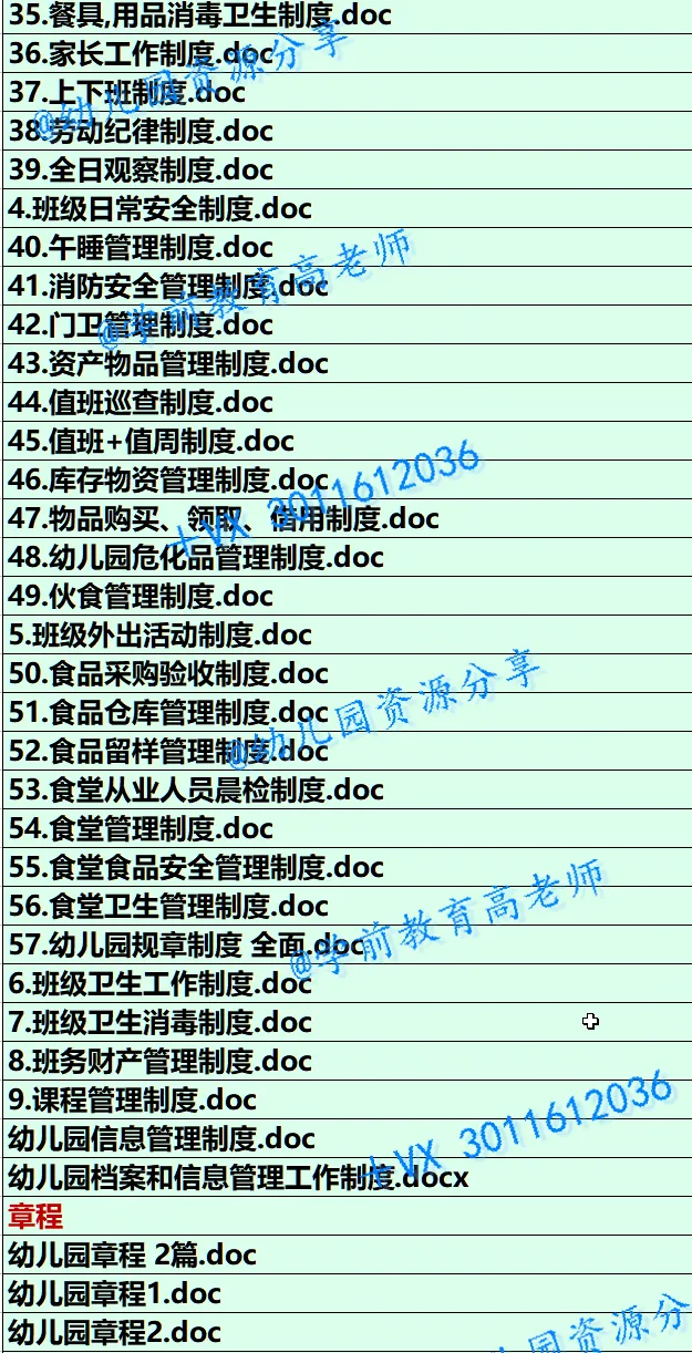 本套资料根据幼儿园年检细则整理而成,分A1党的建设—A2办园条件—A3依法治园—A4财务资产管理—A5办学行为—A6教师权益—A7日常管理—A8奖励加分 八大板块共863个文档,170个文件夹,很全面的一套资料!欢迎试看,咨询!对幼儿园年检具有很强的参考和学习价值。@+VX 3011612036