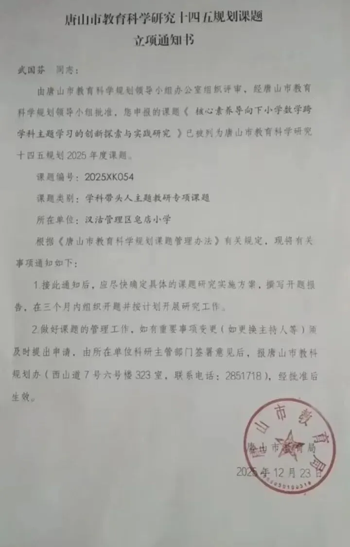 近期顺利完成一项重要工作:唐山市教育科学研究 “十四五” 规划课题 —— 学科带头人专项课题正式开题,完成开题报告撰写及开题论证会相关工作。后续将按研究计划稳步推进。