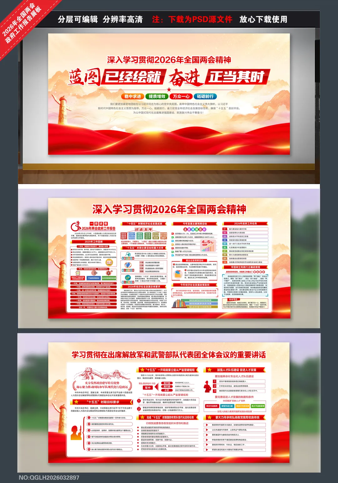 4款大气红色2026年两会工作报告在出席代表团全体会议重要讲话精神展板海报PSD素材图片