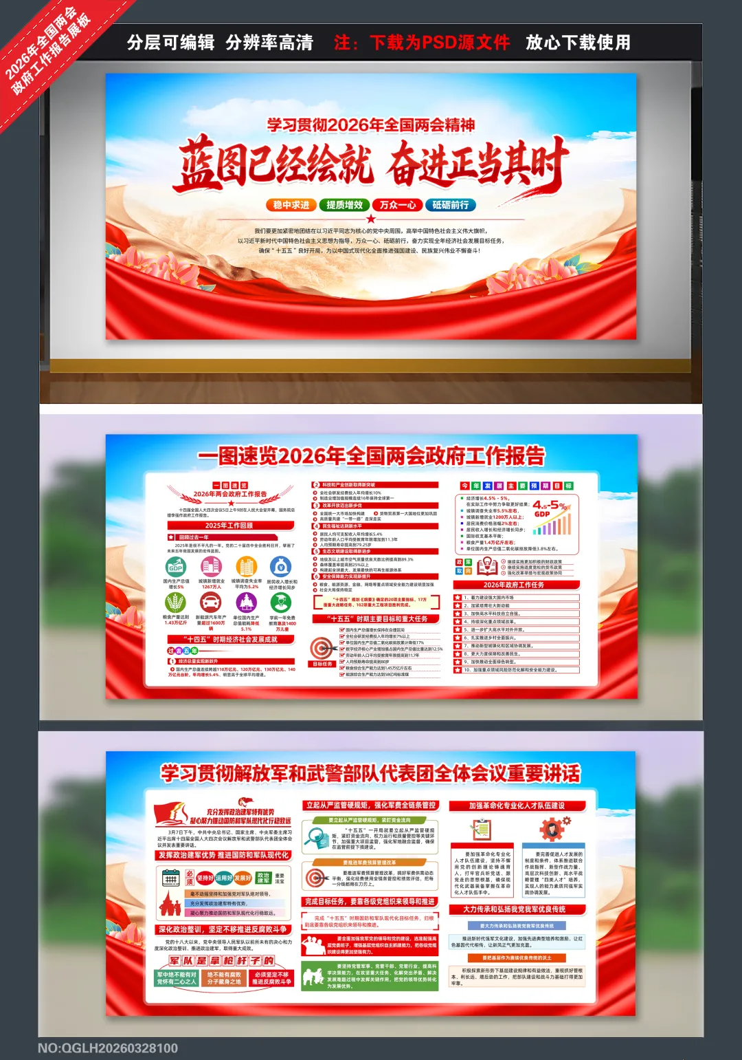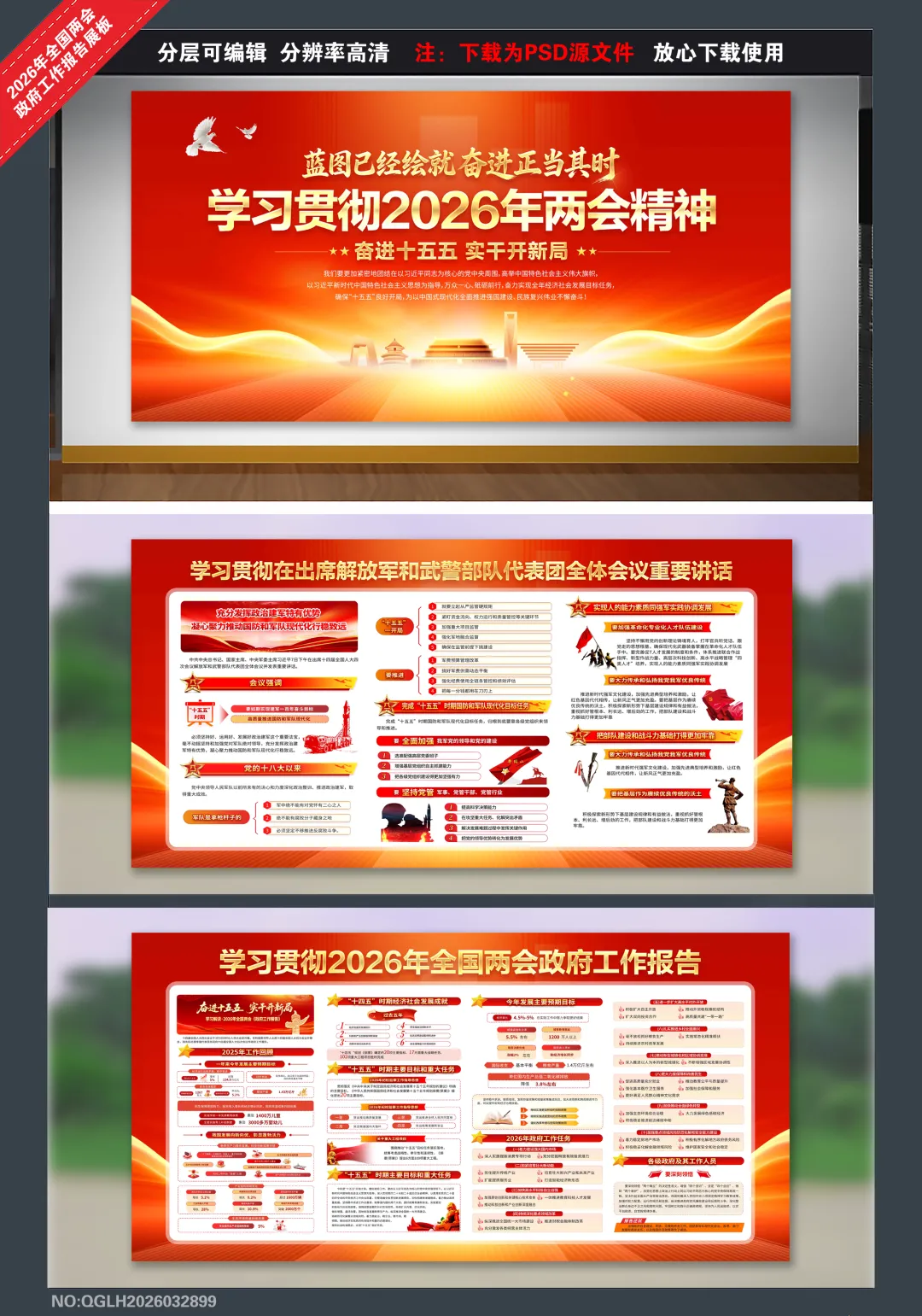 >4款大气红色2026年两会工作报告在出席代表团全体会议重要讲话精神展板海报PSD素材图片