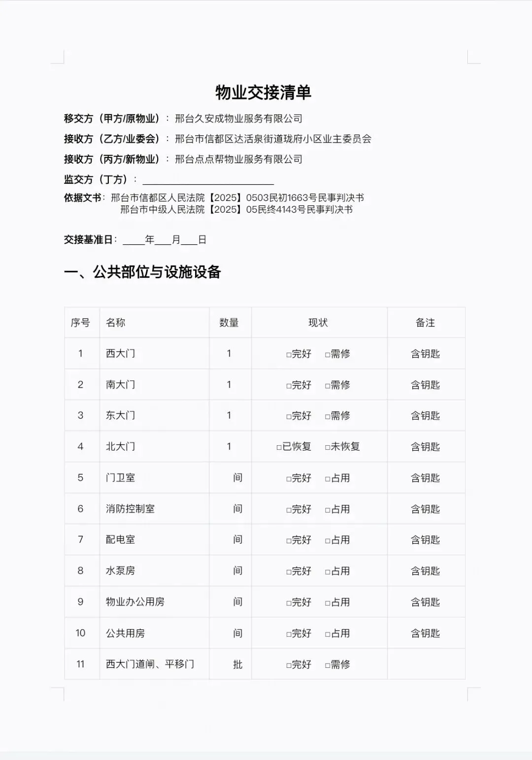 生效民事判决书已判令:邢台久安成物业服务有限公司退出珑府小区并移交相关设施设备及资料档案。