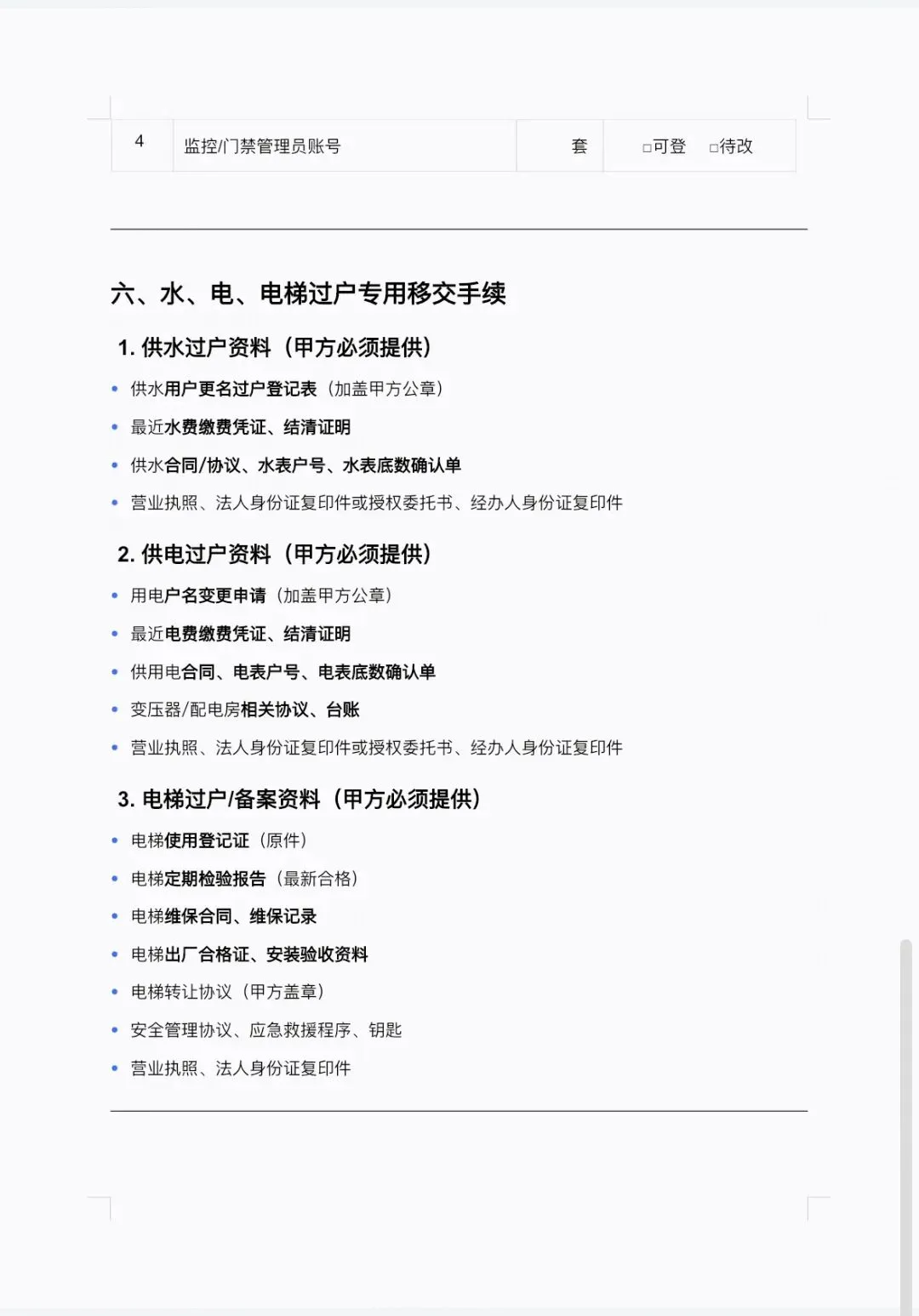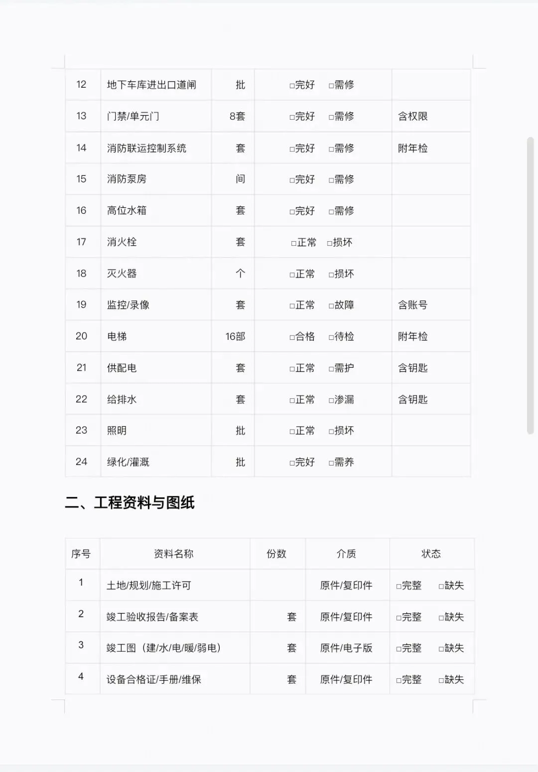 2. 资料档案:竣工图、台账、维保合同、收支明细等;
