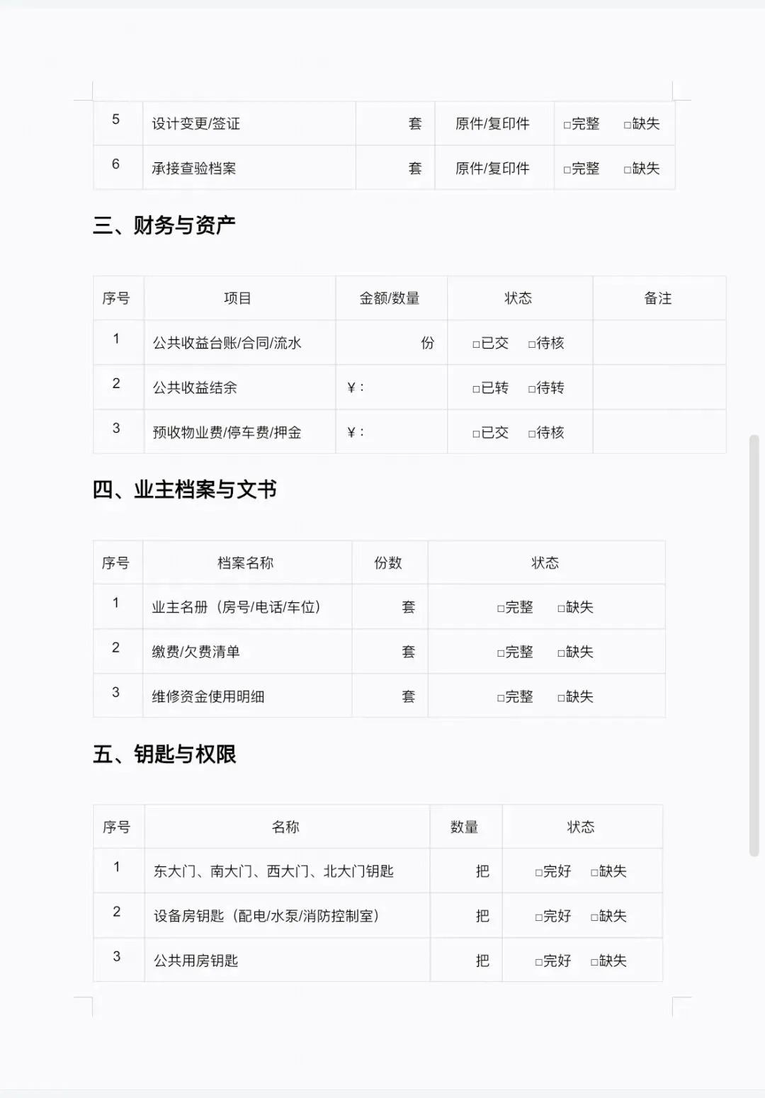 3. 实物资产:物业用房、钥匙、工具、公共资产。