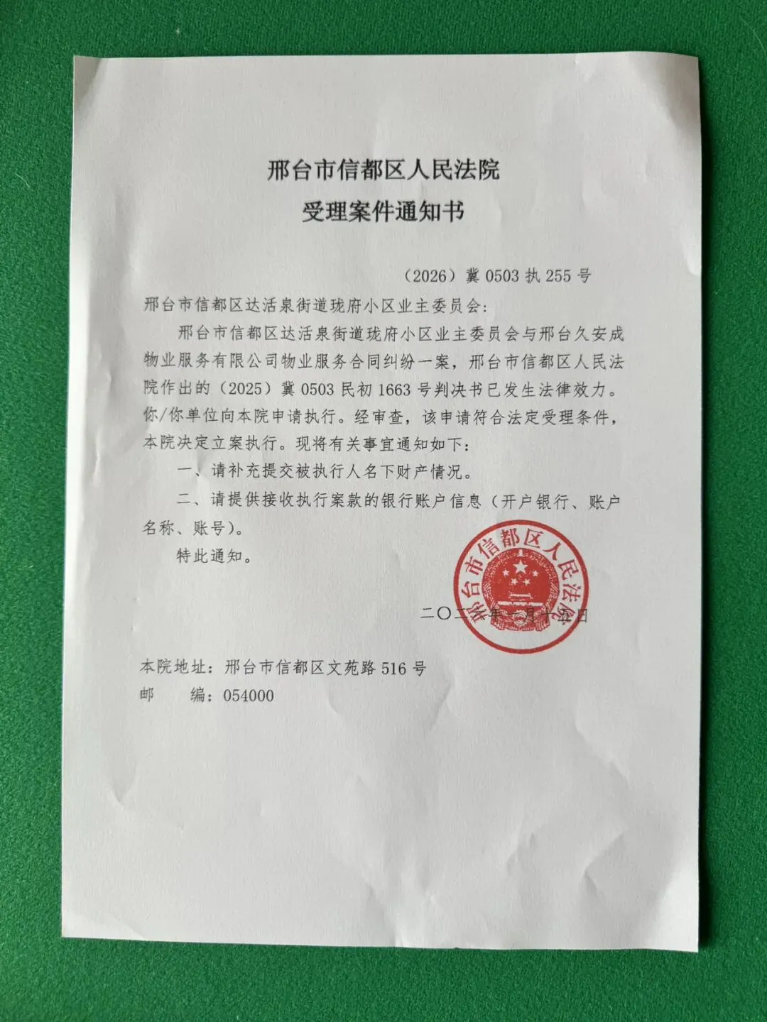 4、3月23日在业委会向执行庭申请下,收到《受理案件通知书》(下附图二),证明1月15起立案;