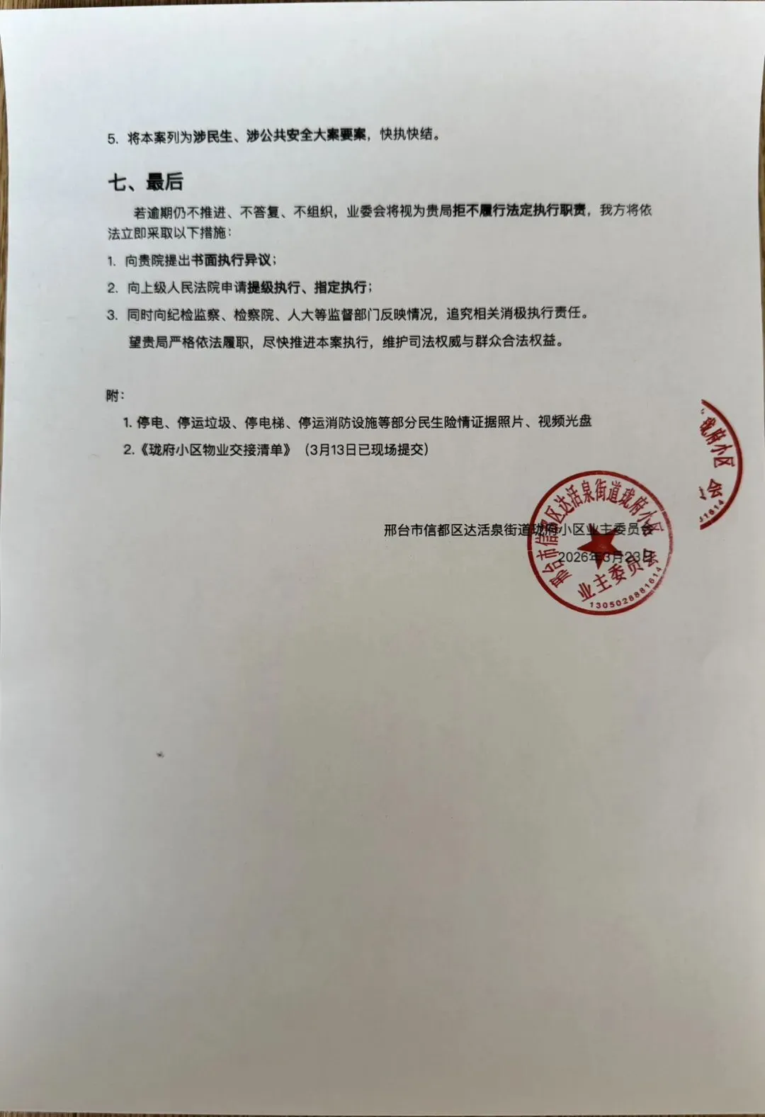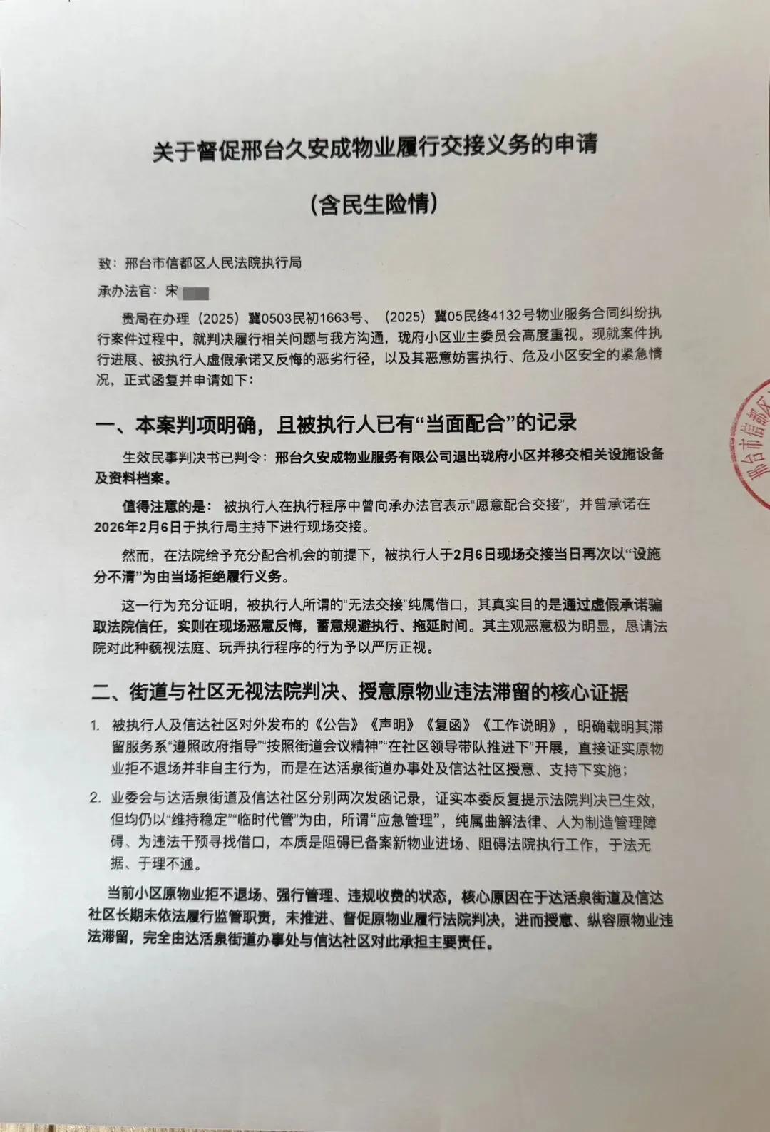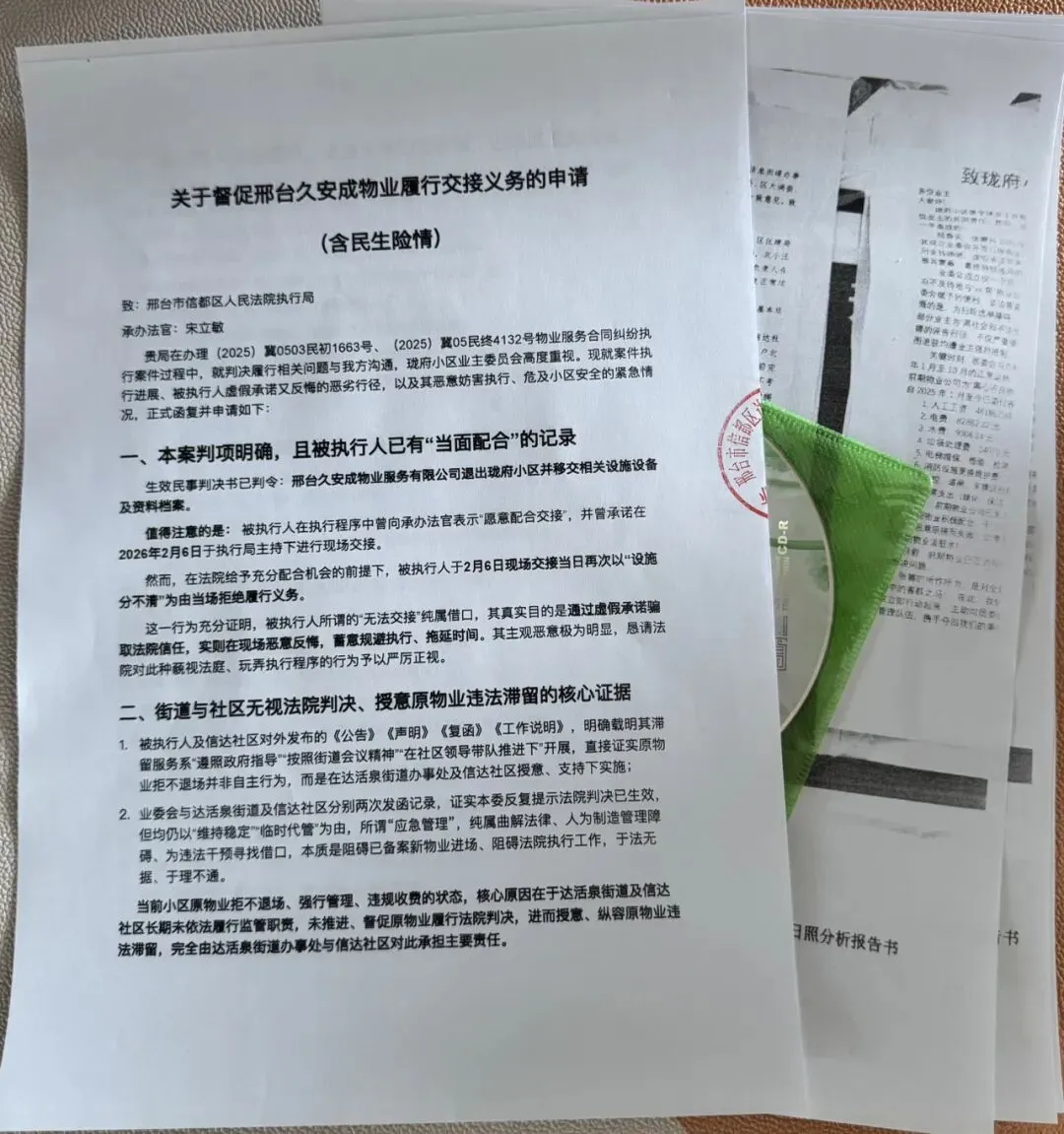 贵局在办理(2025)冀0503民初1663号、(2025)冀05民终4132号物业服务合同纠纷执行案件过程中,就判决履行相关问题与我方沟通,珑府小区业主委员会高度重视。现就案件执行进展、被执行人虚假承诺又反悔的恶劣行径,以及其恶意妨害执行、危及小区安全的紧急情况,正式函复并申请如下: