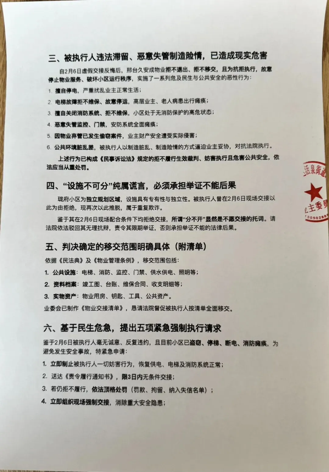鉴于2月6日被执行人毫无诚意、反复违约,且目前小区已盗窃、停梯、断电、消防瘫痪,为避免发生安全事故,特紧急申请: