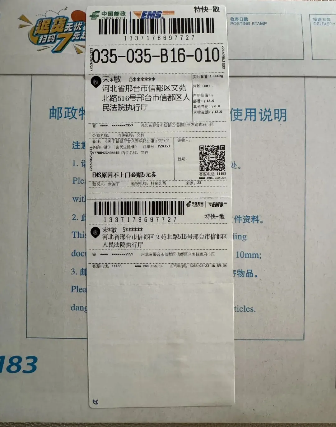 5、3月23日向执行庭邮寄《关于督促邢台久安成物业履行交接义务的申请》(含民生险情)(下附图三)