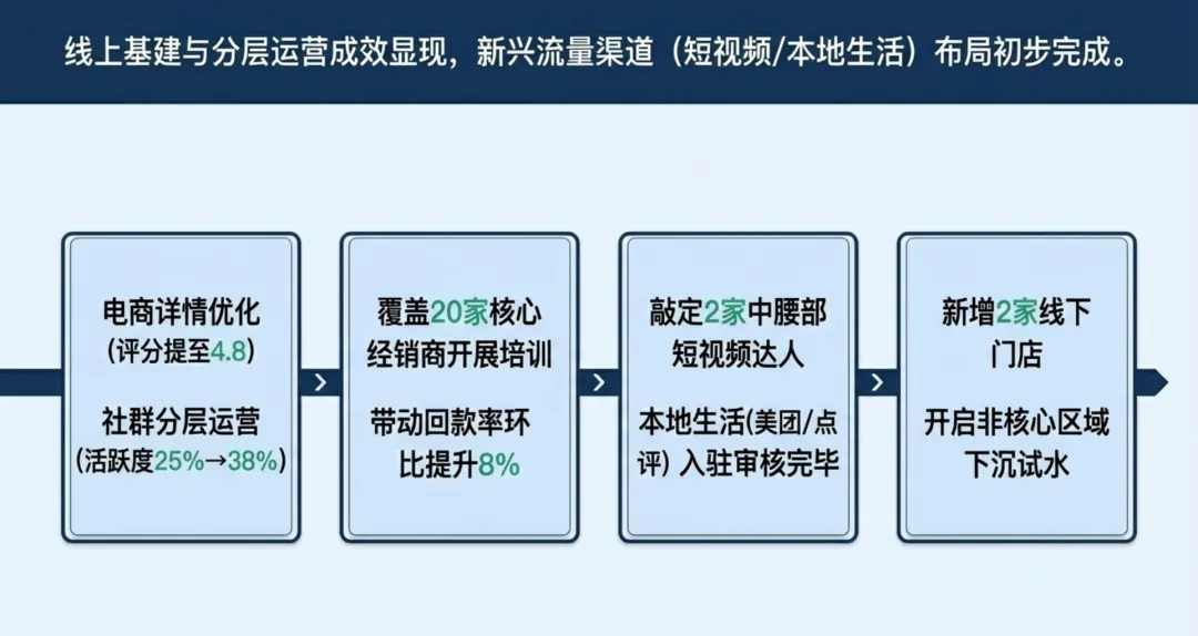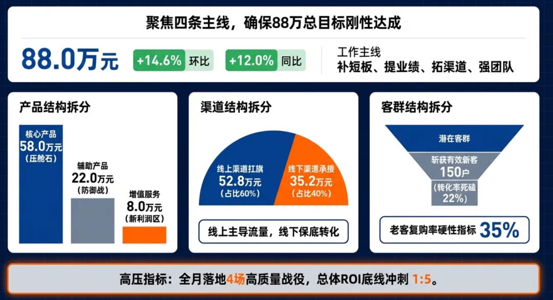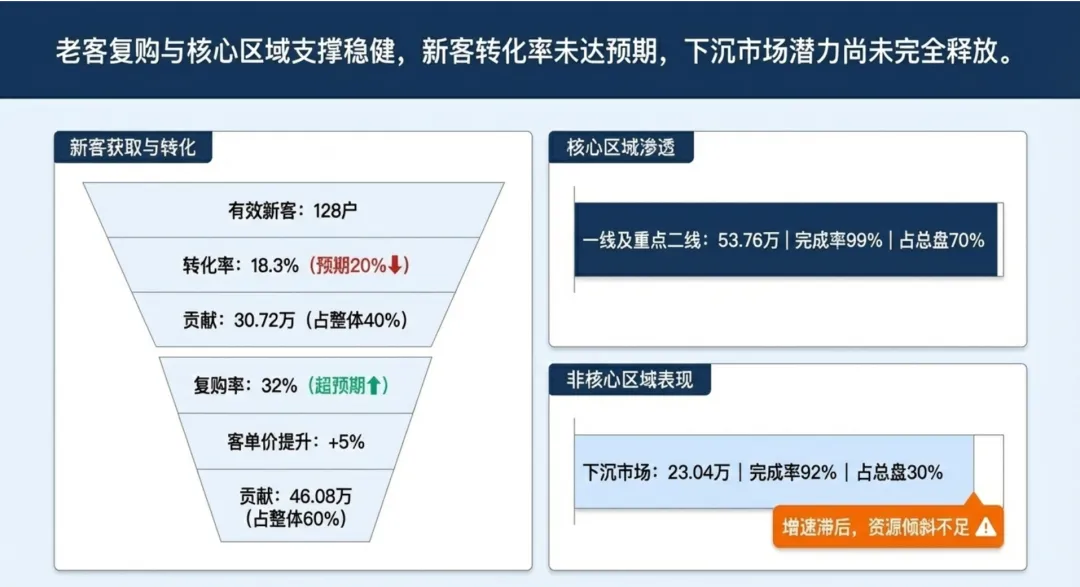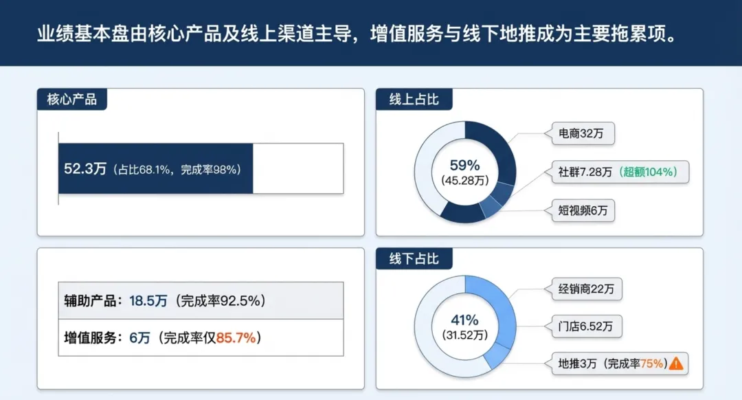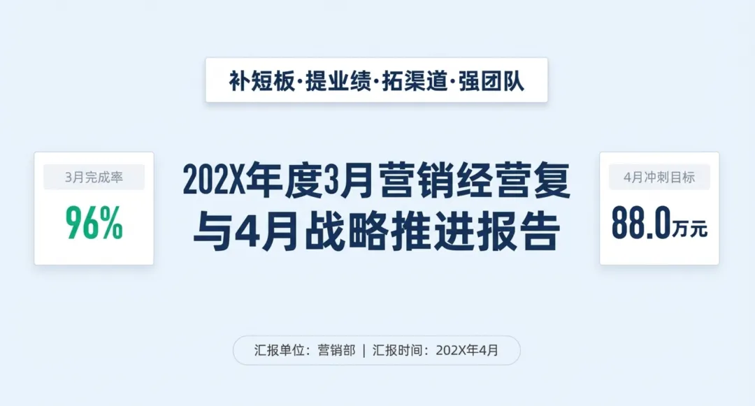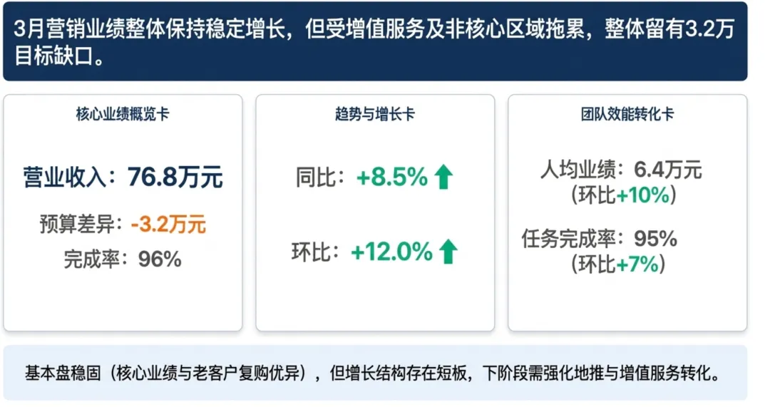 3月作为季度开篇,营销工作围绕业绩冲刺、渠道深耕、活动落地、团队打磨四大核心推进,整体达成阶段性目标,全月实现总业绩76.8万元,完成率96%,环比、同比均实现稳步增长。核心产品、老客户复购及社群渠道表现突出,三场春季主题营销活动全渠道落地,有效带动业绩增长,线上店铺、社群运营优化见效,经销商赋能与客户投诉处理工作有序推进,团队分工与培训落地后,整体工作效率显著提升。