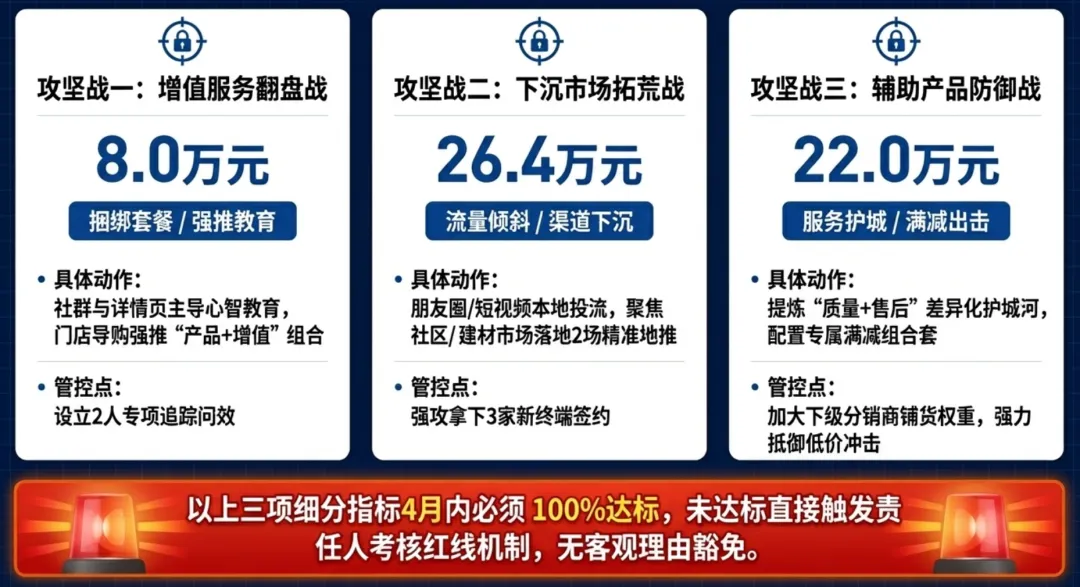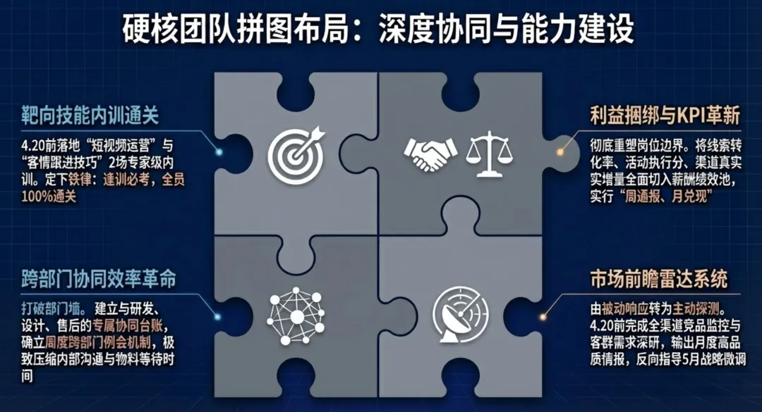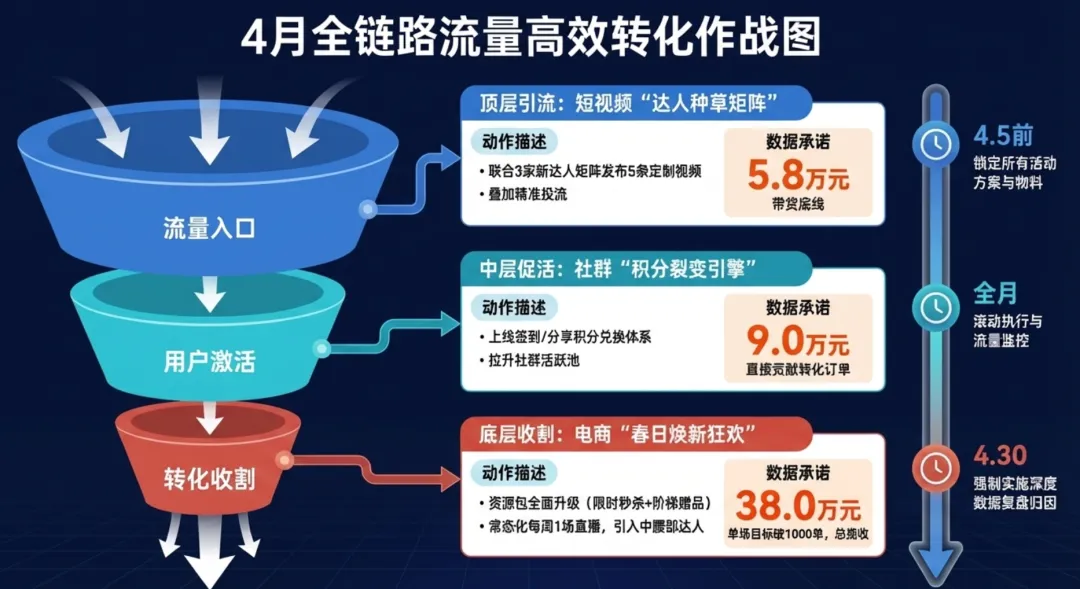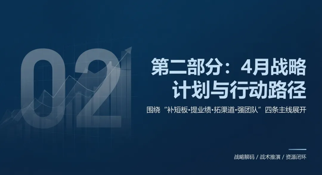四月份的营销重点是补短板,提业绩,拓渠道,强团队,为三月份的业绩目标做好最后冲刺。本月重点推进增值服务的推广、非核心区域的突破和配套产品的突破,完成4个线上线下的全渠道活动的落地,扩大覆盖面,提高活动的 ROI,并在达人、门店等新渠道的拓展上同步推进,优化各个渠道的运营和管理效率。客户管理以精细化跟踪为重点,提高新客户的转化率和老客户的复购率;团队建设以专项培训、优化分工、完善考核为重点,强化团队的专业素质;优化部门间的合作机制,做好资源整合、监控和风险控制;月末全面总结工作,确保季度目标的顺利实现。