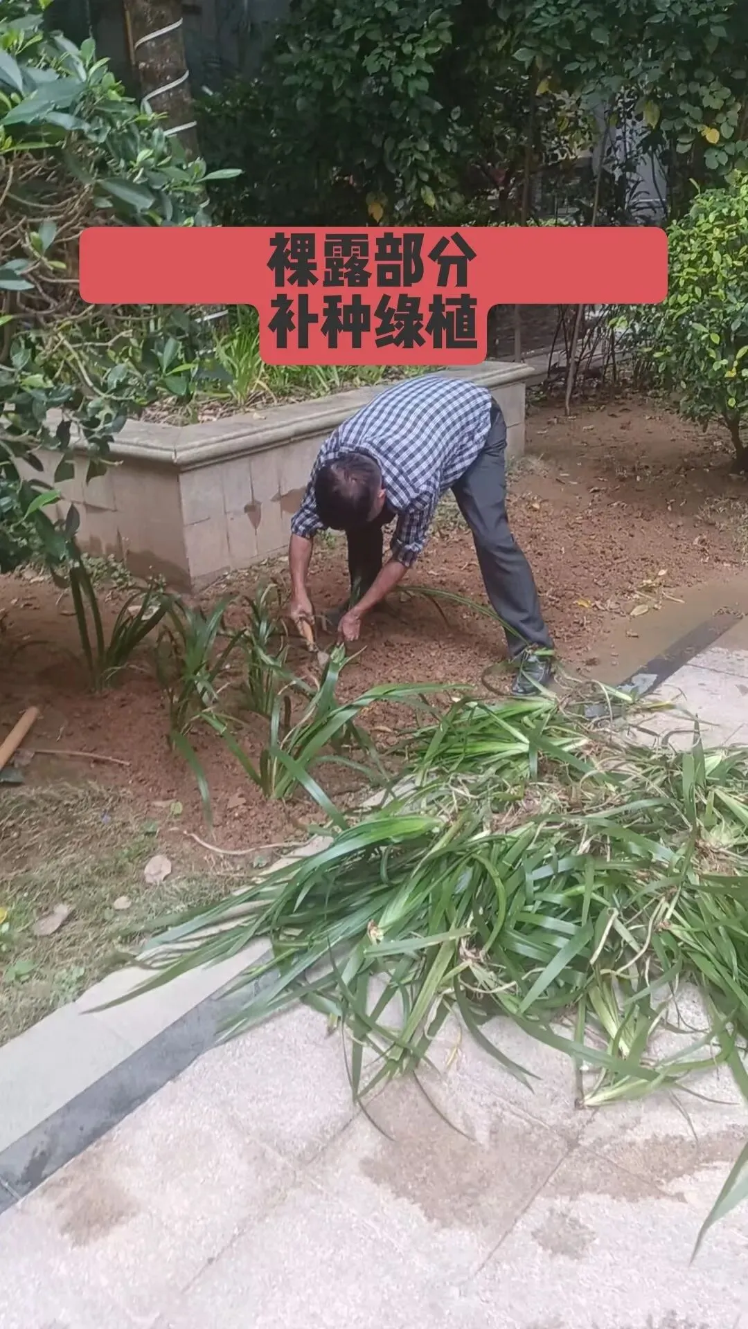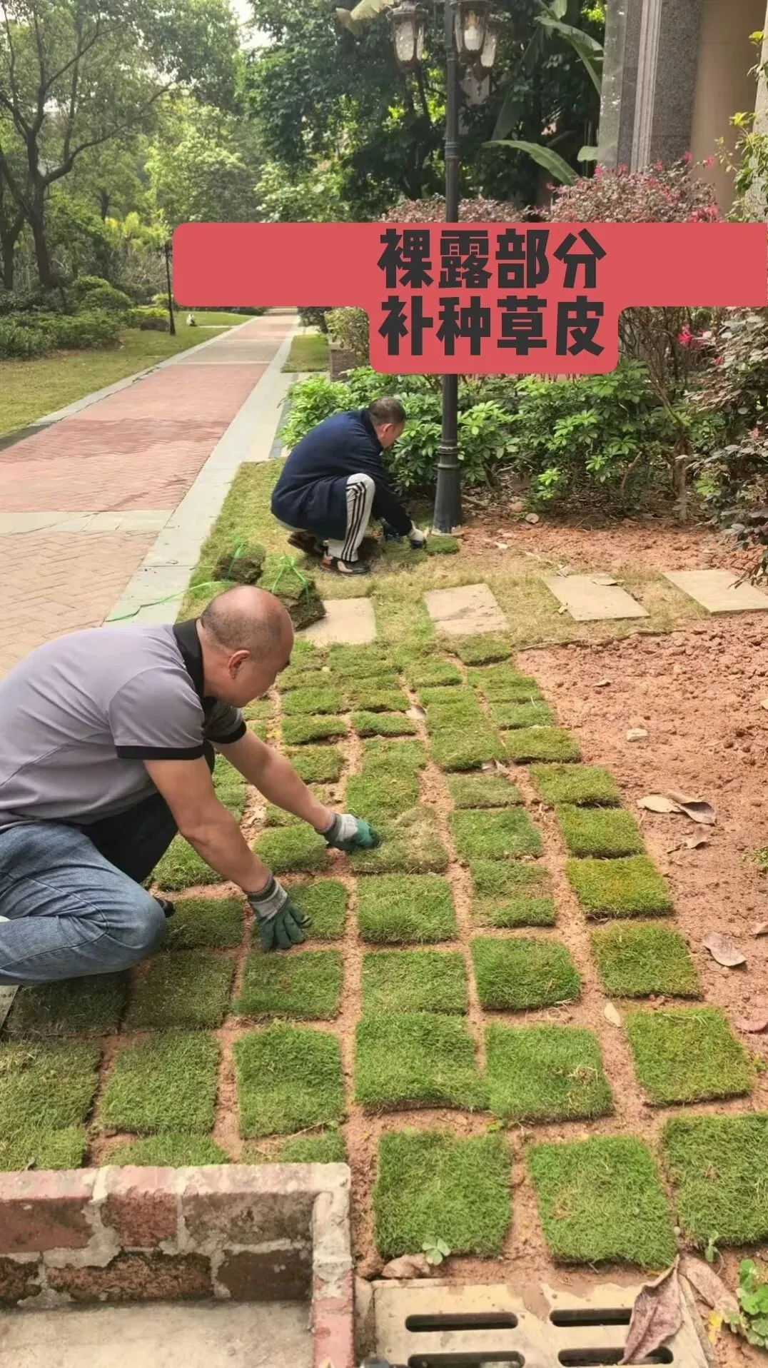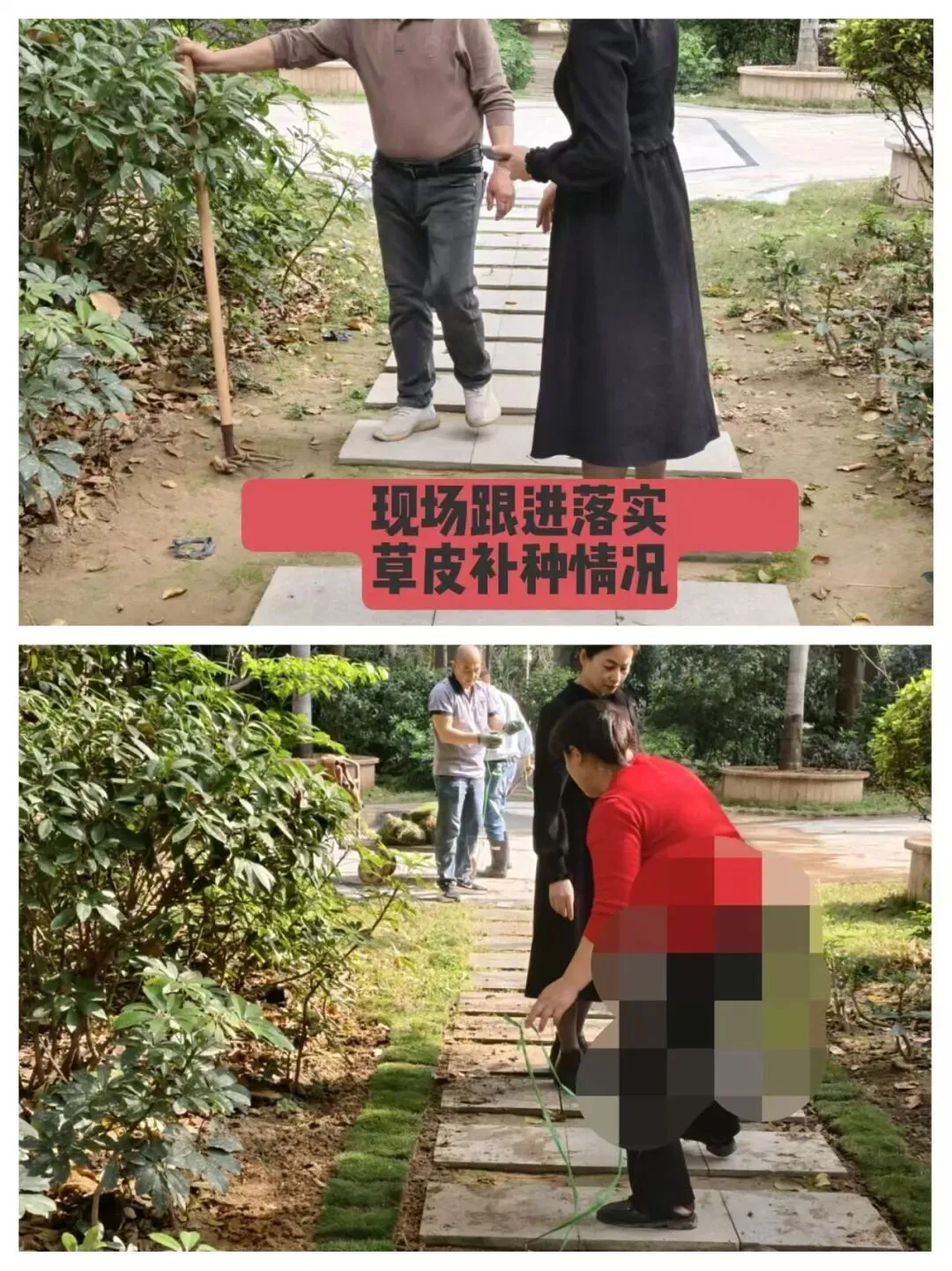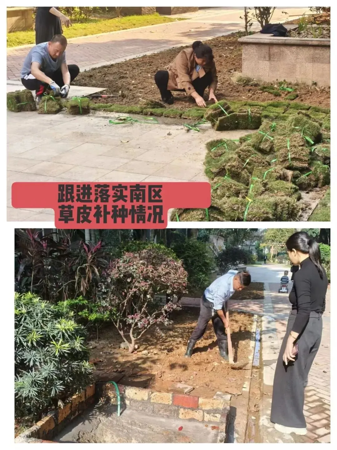 4、现场查看跟进小区绿化裸露地块草皮补种工作;