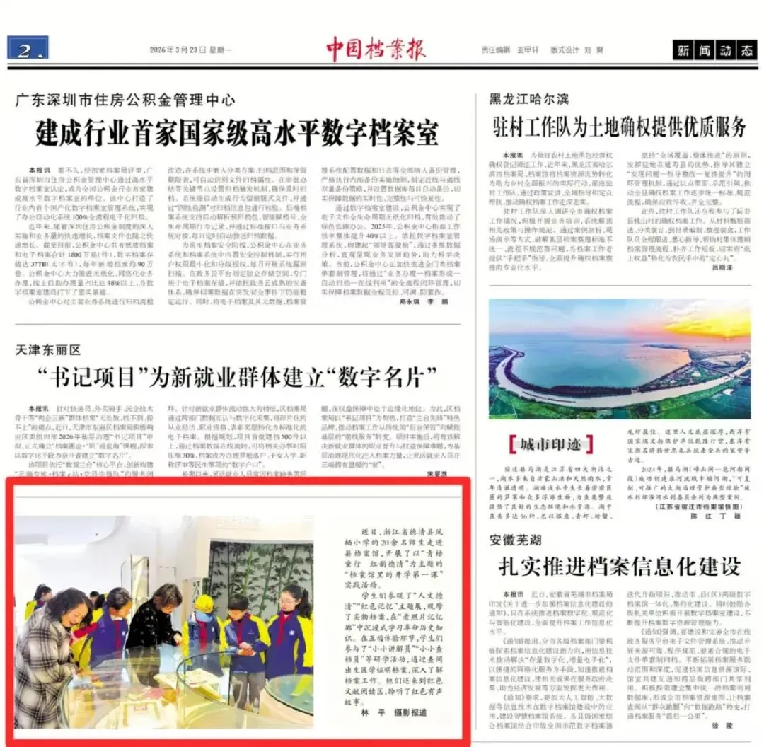 2026年3月23日《中国档案报》总第4417期第2版刊登了《浙江德清 20余名师生走进县档案馆开展实践活动》。 近日,浙江省德清县凤栖小学的20余名师生走进县档案馆,开展了以“青梧童行 红韵德清”为主题的“档案馆里的开学第一课”实践活动。 学生们参观了“人文德清”“红色记忆”主题展,观摩了实物档案,在“老照片记忆廊”中沉浸式学习革命历史知识。在互动体验环节,学生们参与了“小小讲解员”“小小查档员”等研学活动,通过查阅出生医学证明档案,深入了解档案工作。他们还来到红色文献阅读区,聆听了红色有声故事。(摄影报道 林平)供稿:宣传文化处