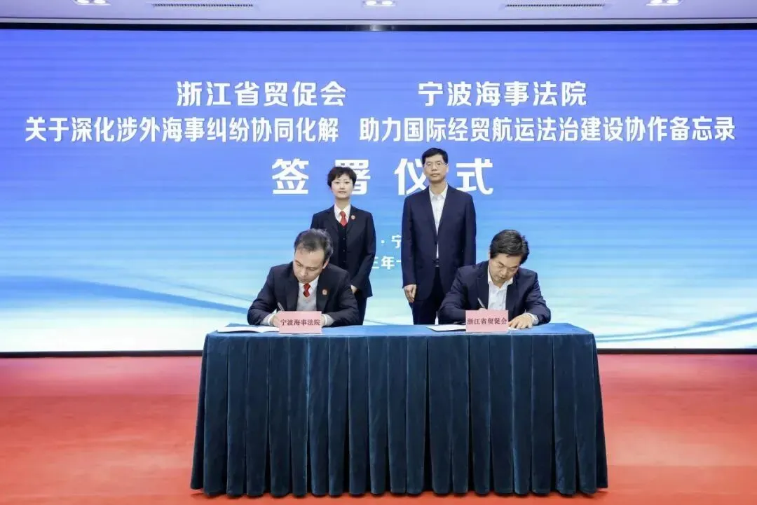 宁波海事法院联合省贸促会建立协同助力国际经贸航运法治建设协作机制,依托全省贸促系统13家调解中心、58家海外联络处、184家友好商协会调解力量,探索域外法查明、涉外法律文书送达、执行协助、调查取证等涉外海事诉讼程序新路径。