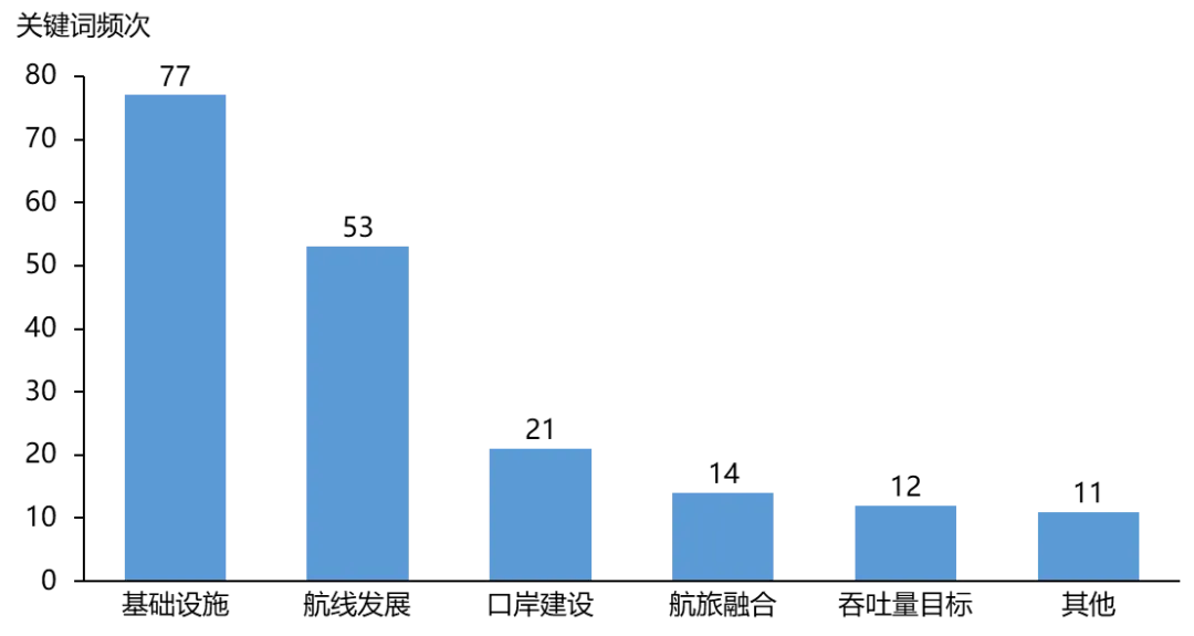 从统计频次结果来看,以机场改扩建为核心的基础设施建设仍持续推进;以“内联外拓”为目标的航线网络优化成为多地提升城市通达能力的措施之一,国内与国际航线布局并重;而航旅融合的相关部署,则深度呼应了国家关于行业融合发展的规划设计,体现了各地通过“航空+文旅”模式激发消费新活力的战略意图。