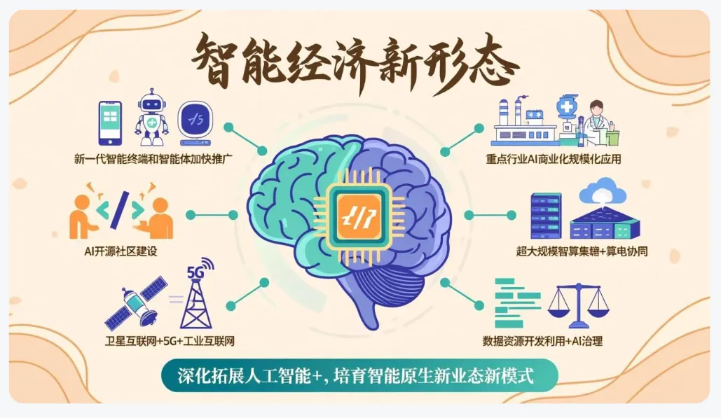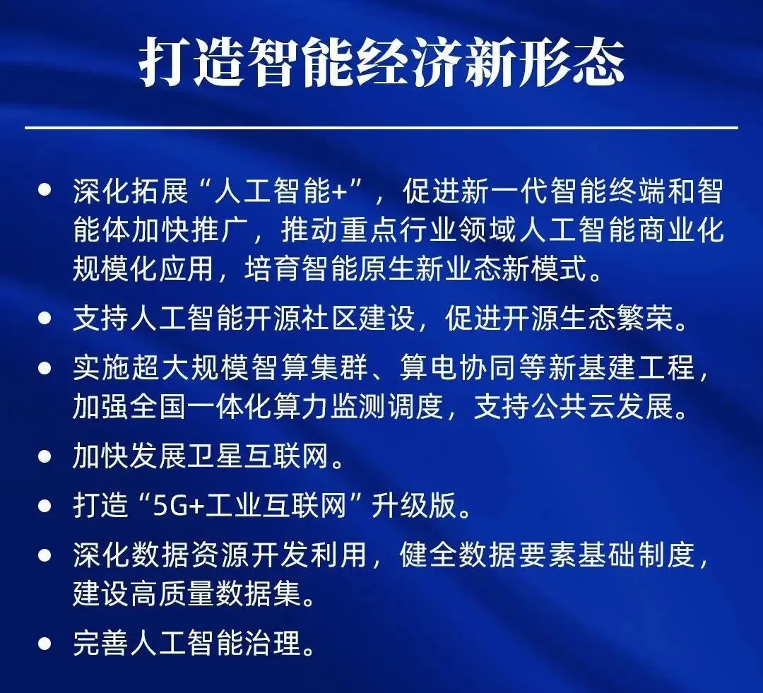 《2026政府工作报告》首次提出“打造智能经济新形态”,并围绕“人工智能+”、算力基础设施、数据要素、智能应用等作出系统部署。