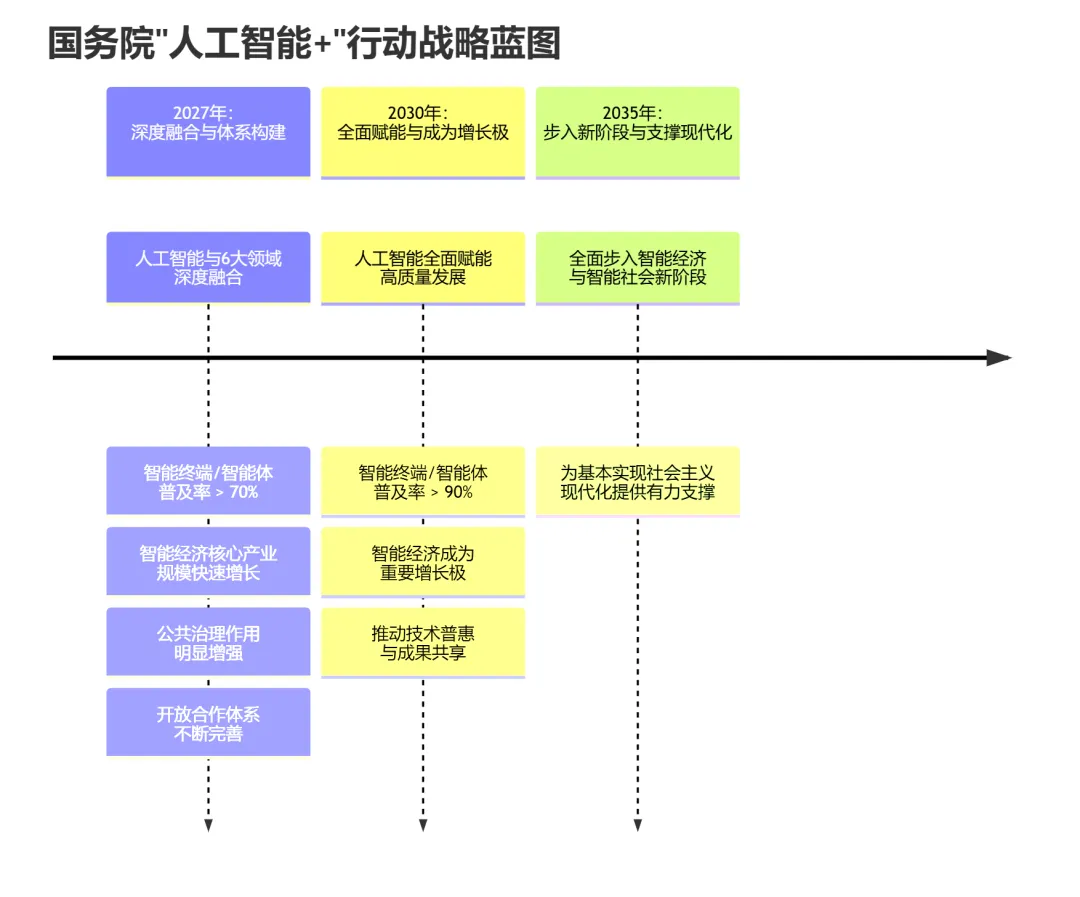 2025年8月发布的《国务院关于深入实施“人工智能+”行动的意见》提出2027年、2030年、2035年三个阶段目标,每个阶段的目标均提及“智能经济”。