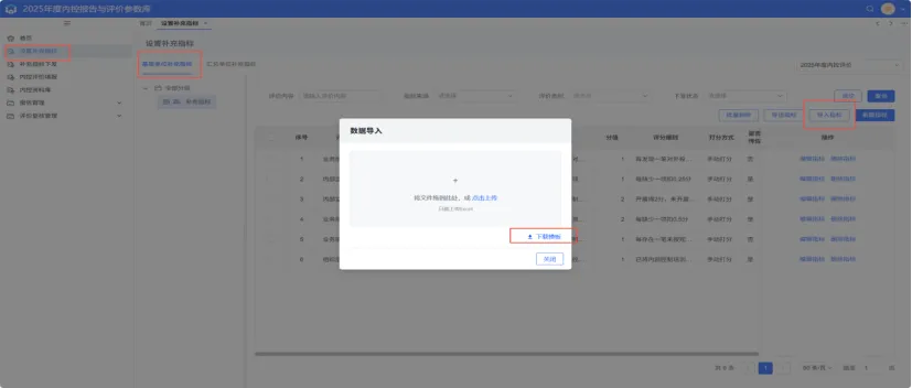 三、也可以导入指标。点击【导入指标】,弹出数据导入窗口,点击窗口中的【下载模板】可以下载补充指标设置模板。按照模板要求,填写补充指标后,【点击上传】,上传要导入的指标。