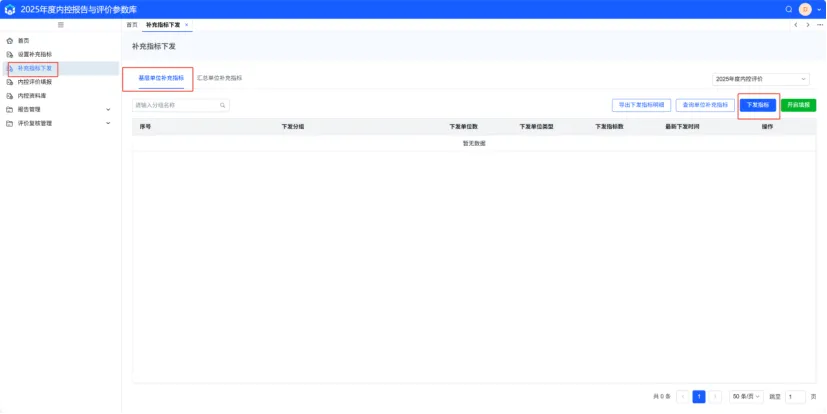 四、下发单位补充指标。主管部门登录系统进入【补充指标下发】模块,在【基层单位补充指标】页签点击【下发指标】,弹出下发指标窗口。