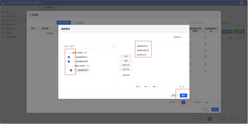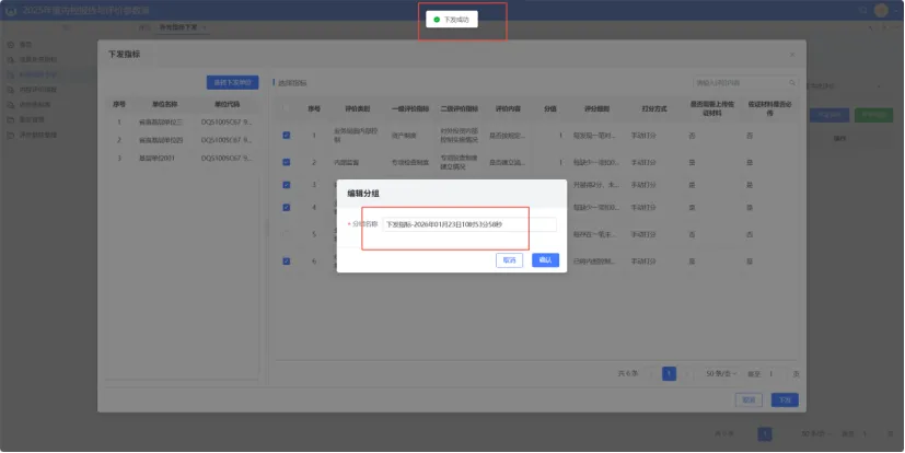五、选择下发单位,并勾选指标后点击【下发】,执行下发操作。下发后,系统提示下发成功,并自动记录一条数据形成一个下发分组。