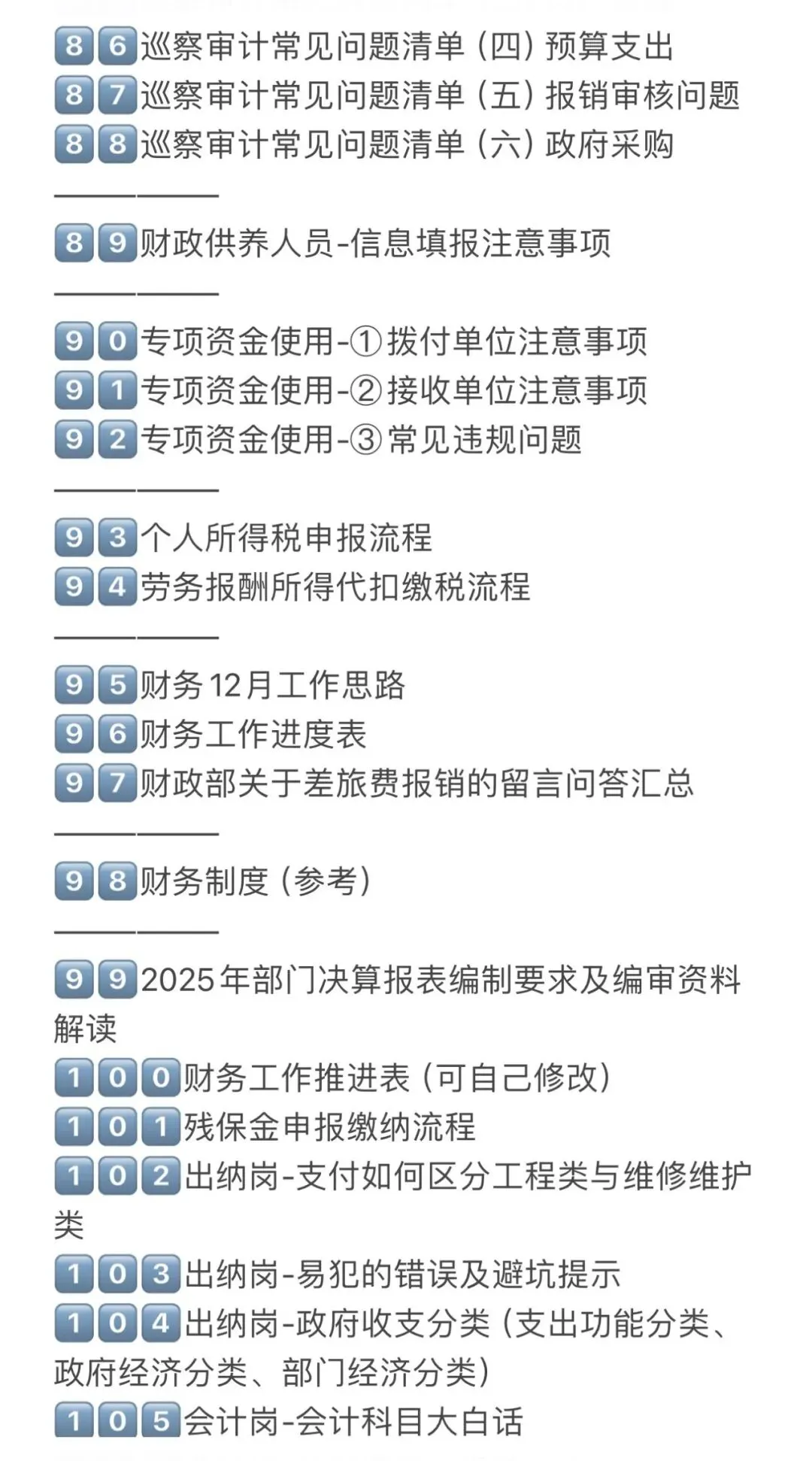 辣辣参加工作13年,财务负责人,一对一指导300➕财务小伙伴。在这个过程里,辣辣也根据业务实操,结合小伙伴们的高频问题点,整理了一套涵盖出纳、会计、资产、采购、审计、预决算编制、财报等各类专项业务的知识库!知识库是什么👇
