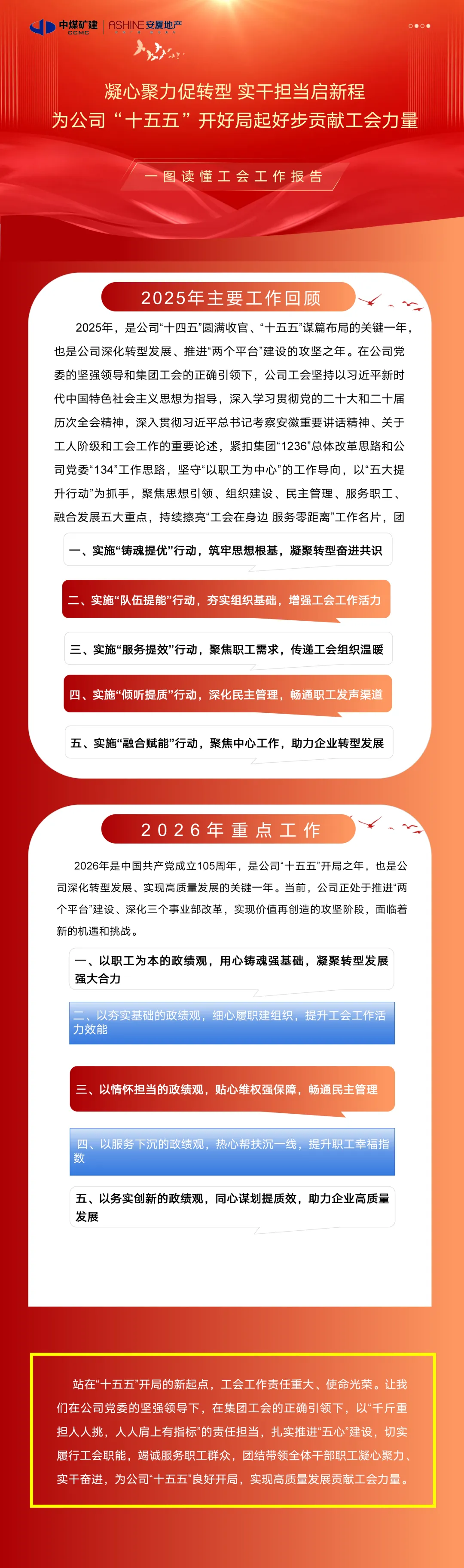 一图读懂工会工作报告——凝心聚力促转型 实干担当启新程为公司“十五五”开好局起好步贡献工会力量