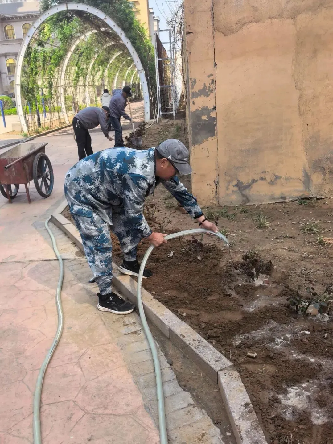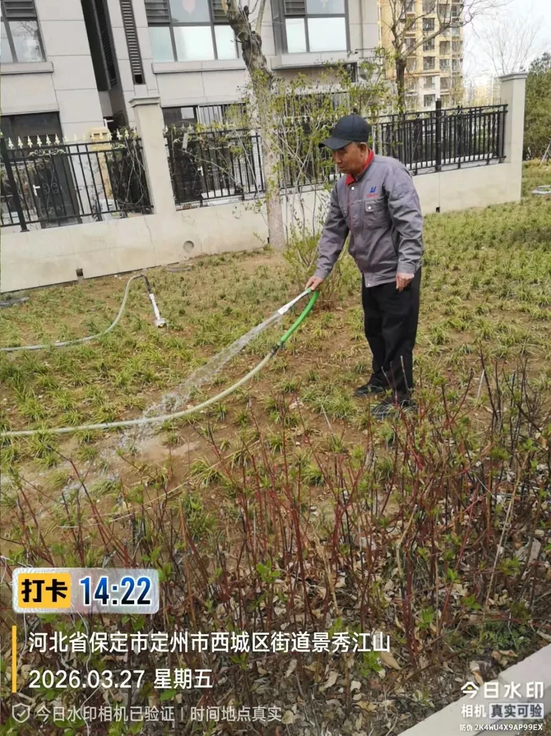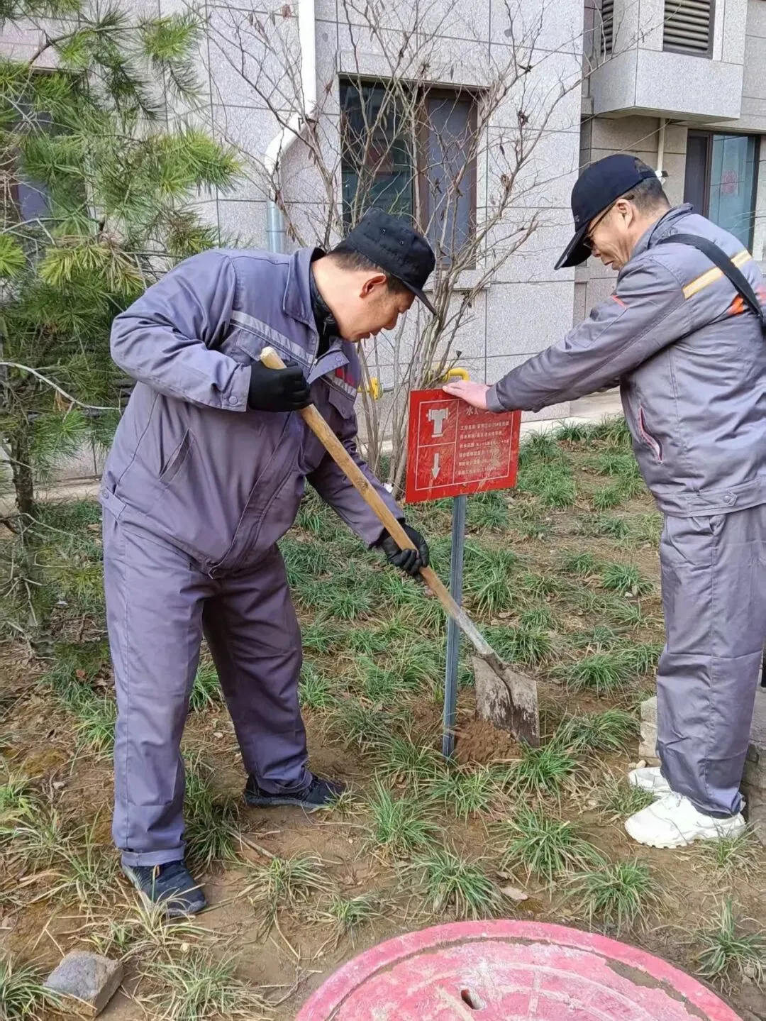 绿化师傅们精心呵护着小区的一草一木。他们在3月对草坪进行了修剪浇水、绿植移植补种,经过他们的努力,小区的绿植生机勃勃绿意盎然。