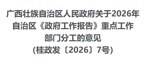 为全面贯彻党的二十大、二十届历次全会和中央经济工作会议精神,深入贯彻落实自治区党委十二届十一次全会、全区经济工作会议精神以及自治区十四届人大五次会议通过的自治区《政府工作报告》部署要求,做好今年政府工作,实现我区经济社会发展目标任务,现就2026年自治区《政府工作报告》确定的重点工作,提出部门分工意见如下。
