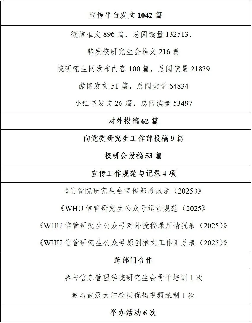 坚持守正创新。思想引领、SIM原创、心林来信、权心权益、学科咨询、求职来信,共1042篇发文。微信公众号、院研究生网、微博、小红书等新媒体平台矩阵共同发力,充分发挥外宣优势。