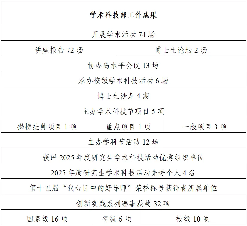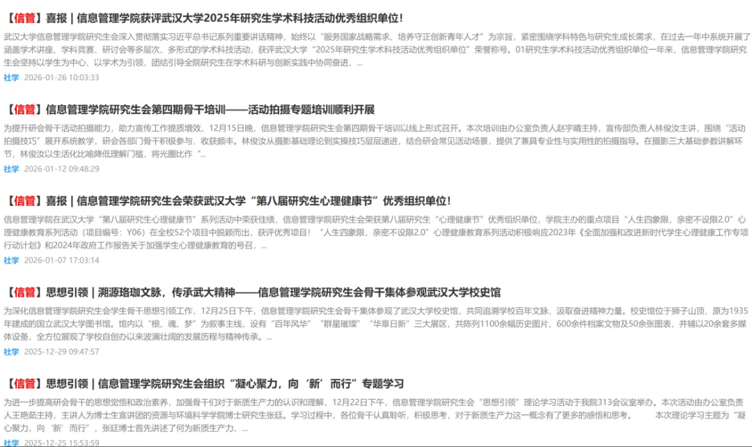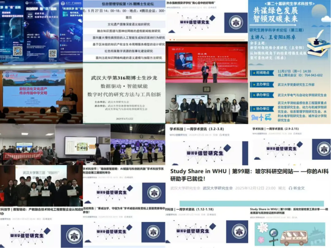 以学生为中心、学术为引领。自主举办学术活动74场及学科节活动13场,协办第二十一届网络科学与工程论坛、2025珞珈大数据论坛等高水平学术会议13场,共服务国内外 17000余人次。承办校级学术活动6场,获评“武汉大学2025年度研究生学术科技活动优秀组织单位”。组织研究生参与科创赛事,获“华为杯”数学建模竞赛全国一等奖、美国大学生数学建模竞赛Finalist奖、武汉大学研究生学术创新奖一等奖等各级荣誉32项。
